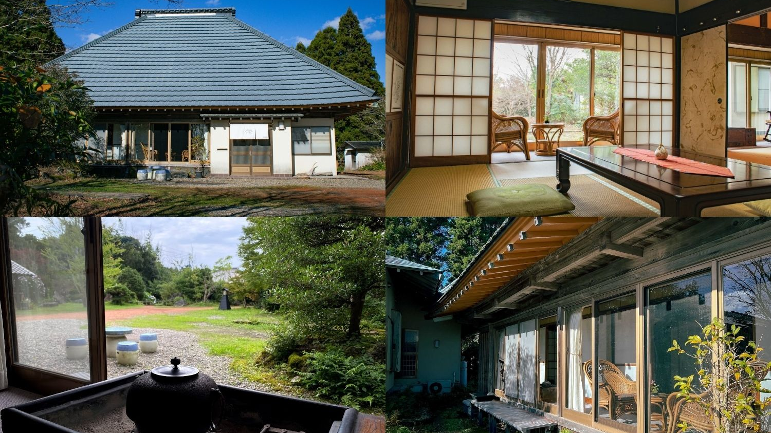 古き良き雰囲気を残しつつ、現代的な生活に合わせて丁寧にリフォームされた古民家宿になります。広々とした和室や、リビングなどの内観だけでなく、縁側や外観なども画になります。一本道を進んだ先にある古民家なので、人里離れた住宅としてのシチュエーションにぴったりです。
