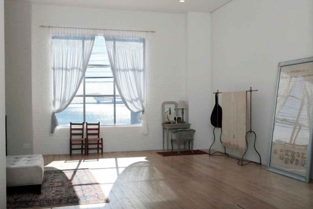 5.5mの天井高と斜めのコンクリート壁が印象的なハウススタジオです。ナチュラルで風合いが出てきた床と壁一面に広がる棚は、デザインーズ物件の様相でスタジオ特有の作られた雰囲気を感じさせません。 壁一面の大きな窓も特徴的で、コンクリ壁や棚、窓など背景を好きに選べるのも魅力の一つです。美術やセットを入れ込むことで、豪邸の書斎やプライベートルームなどの落ち着いたお洒落なシーンを作り込むことができます。
