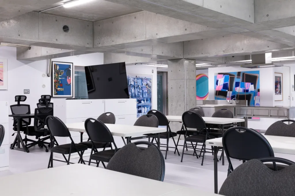 100名ほど収容可能な多目的な用途で利用できるレンタルスペースです。ネオンサインの照明が全体に装飾され、エモさと近未来のサイバー感を纏っています。メインフロアは、LEDモニターとPCがズラッと並ぶ唯一無二のロケーションになります。美術や小道具を持ち込まなくても、先進的なオフィス、オシャレな司令室、アジト、クラブ、ラウンジ、パーティーなど幅広い設定が簡単に作れるので、再現ドラマや縦型ドラマの撮影にも重宝します。