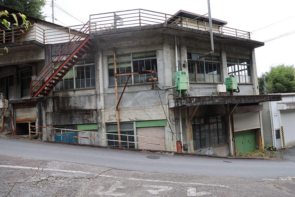 工場らしい無骨で大きなドアが印象的で、日中でも薄暗くアングラな演出にピッタリな廃墟です。錆びついた階段を登った先にある屋上には、プレハブ小屋が並びます。