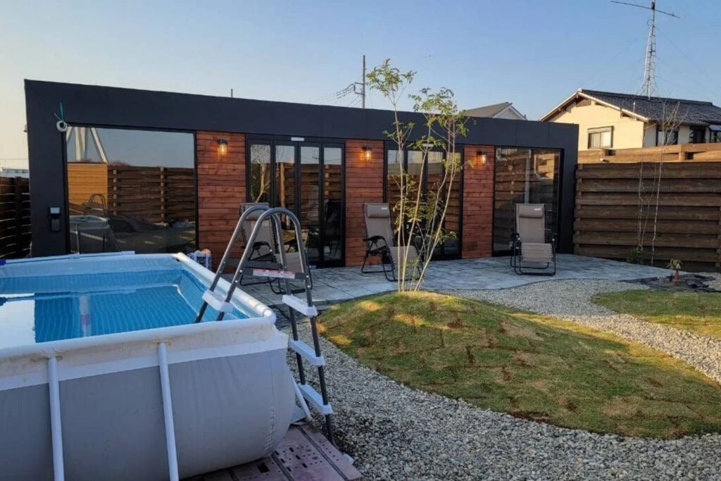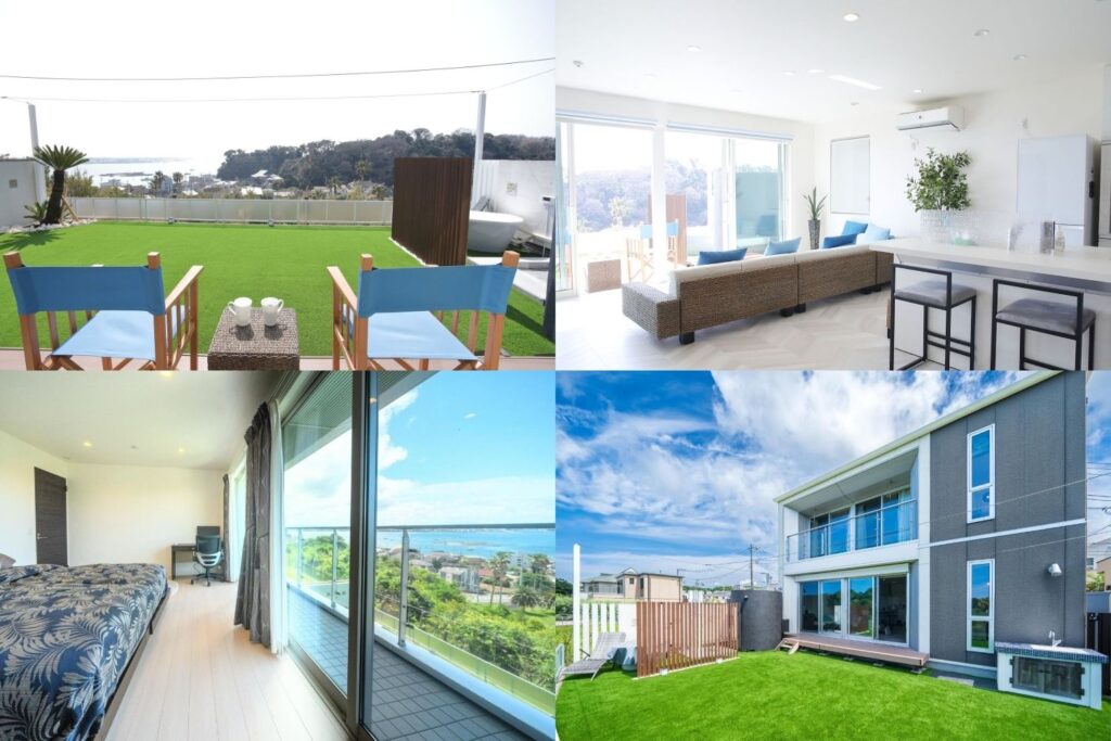 海を見下ろす高台に位置するオーシャンビューが自慢の貸別荘です。三浦半島の海を一望できる芝生ガーデンには、日本初の縦型サウナと水風呂をご用意しており、真夏でも15度の水風呂で”最高のととのい”をお約束します。