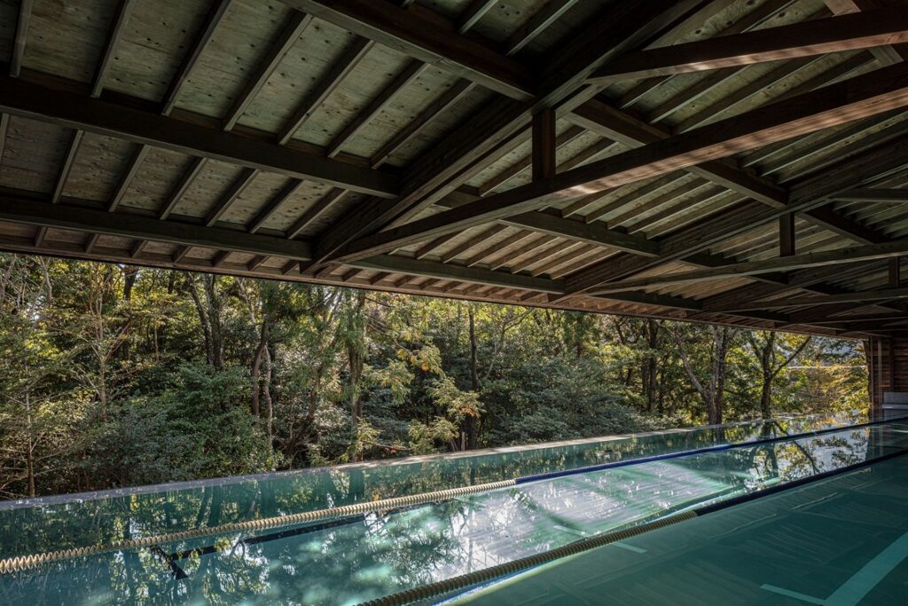 森を抜ける風が通り、気持ちの良い自然光の入るロケーション抜群の屋根付きインフィニティプール(25mプール)と、全国的にも珍しい水深8mのダイビングプール、さらにフィンランド式サウナや温泉、レンタルバイクなどを提供。