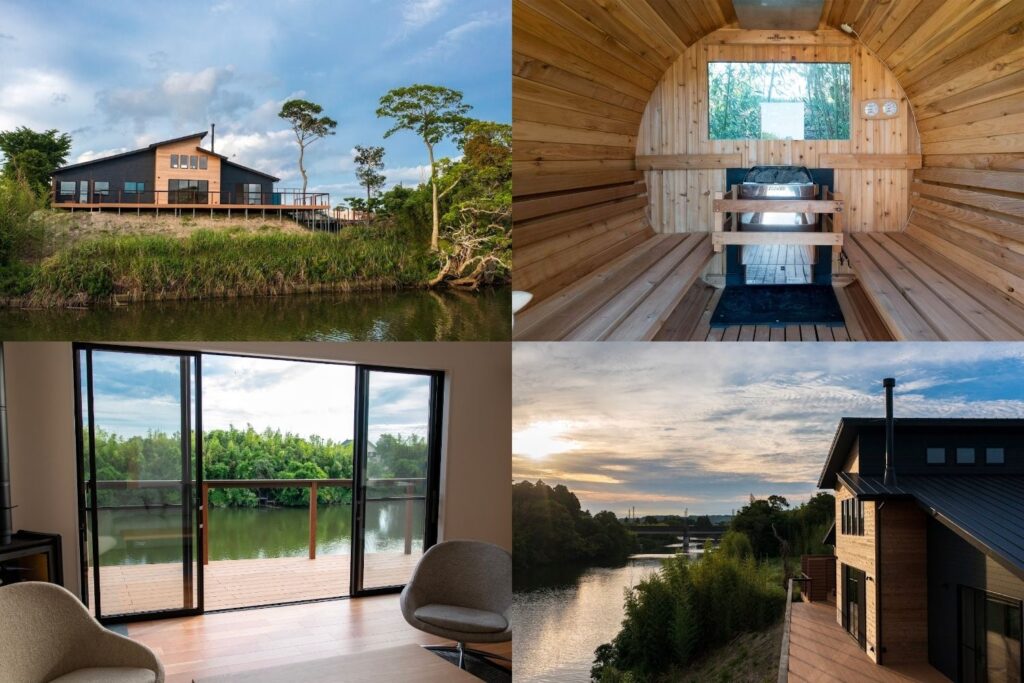 ゆるやかに流れる夷隅川を臨む自然豊かなロケーション。大きな窓からは優しく差し込む朝陽や房総半島の山々に沈む黄金の夕日を眺めることができる、隠れ家的コテージです。