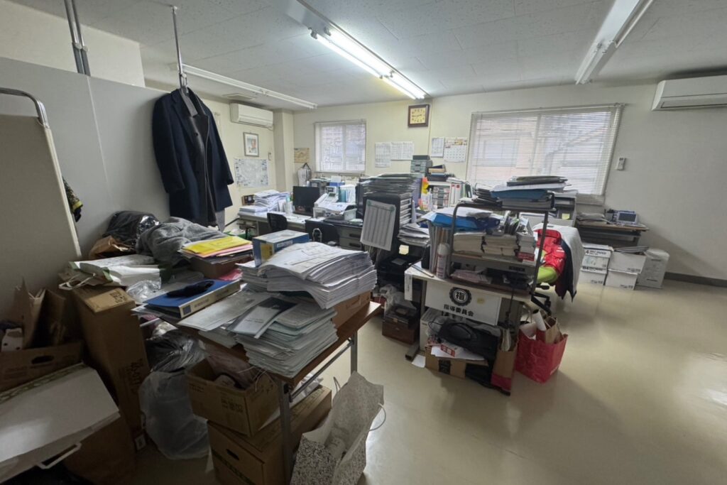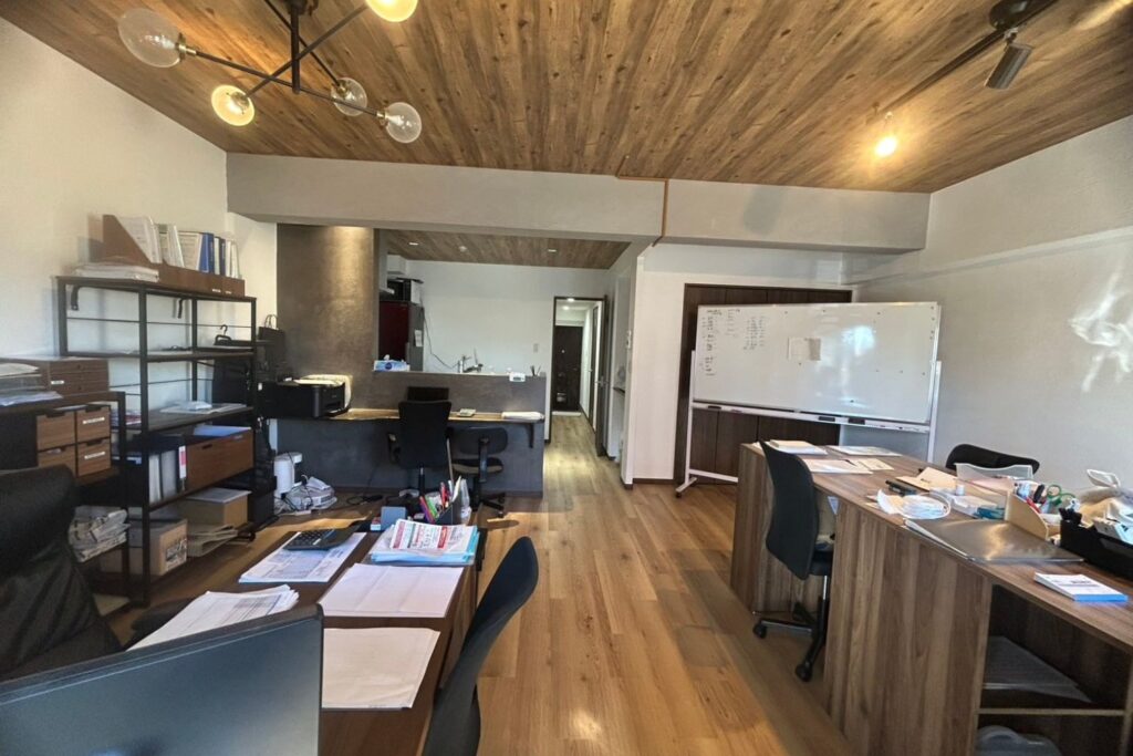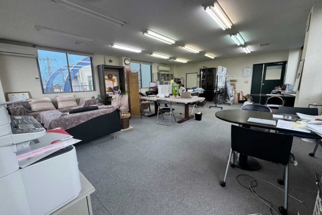 階段を上がると、ワンフロアにデスクと応接エリアがまとまる事務所がございます。電話機やコピー機、ホワイトボートなど、イメージ通りオフィス空間です。