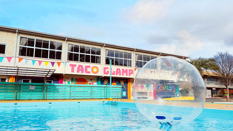 〜ナイトプールやカラオケ、サウナまで完備するメキシカンな雰囲気でカラフル廃校グランピング施設〜