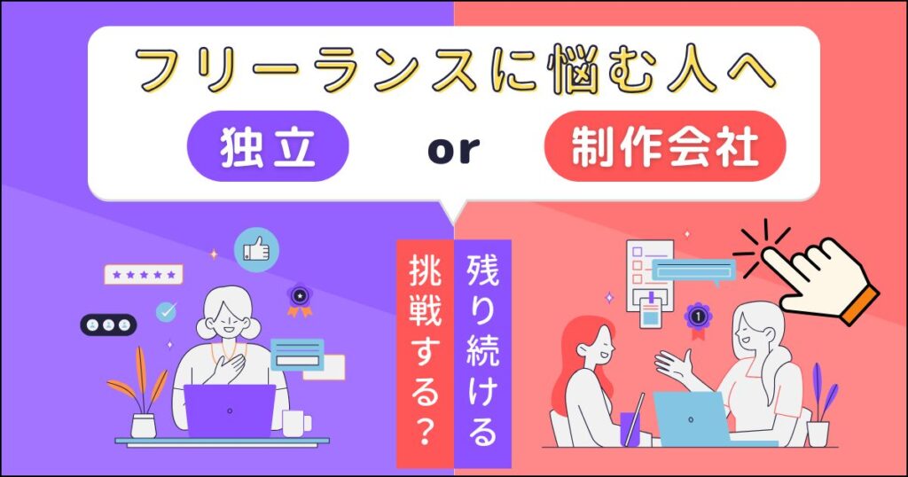 現役フリーが徹底解説したフリーランスになるか?制作会社に残るか?をまとめている記事もありますので、こちらも読んでみてください。