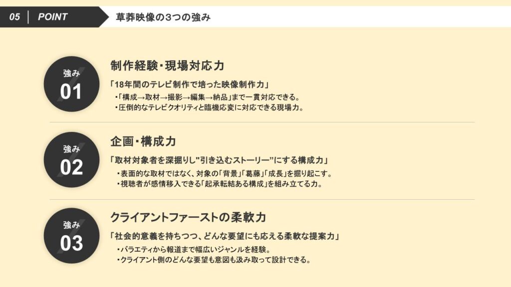 ドキュメンタリーが得意でありながらも、数多くのテレビ番組を手掛けてきた経験と実績があるので、バラエティ系や情報系など幅広い映像制作を任せることができます。