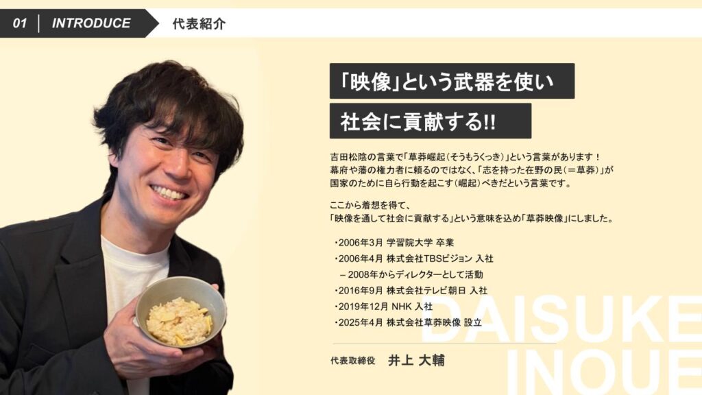 ReHacQや街録chにも出演された元テレレビ局員の井上大輔さんが立ち上げた会社で、「テレビクオリティーの映像制作を頼みたい!」と考えている方は、絶対にチェックしておくことをおすすめします。