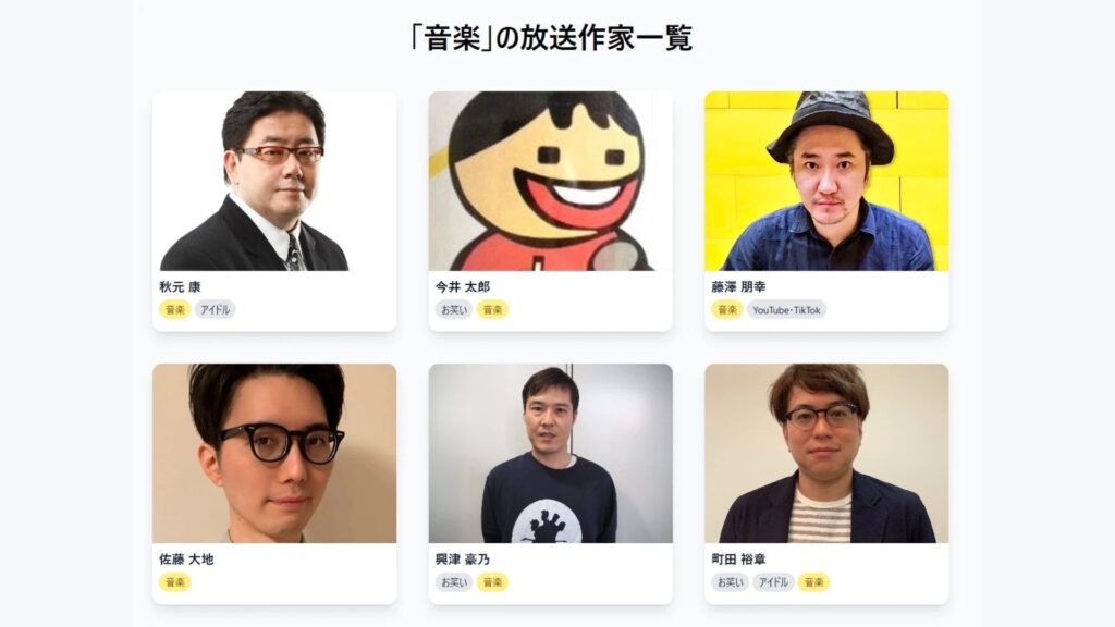 お笑い・グルメ・アイドル・競馬・野球・音楽・クイズなど細かく作家の強みを紹介してくれています。