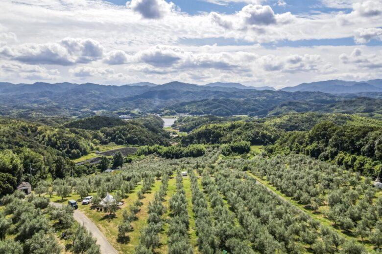 60,000㎡の敷地内に1500本のオリーブの木が生るオリーブ畑です。証券マン時代に、オリーブや香川の魅力に惹かれ、2015年に茶畑を1から整備しオリーブ園を始めました。いま敷地内に一棟貸しのお宿、グランピング、テントサイト、カフェなども展開しています。