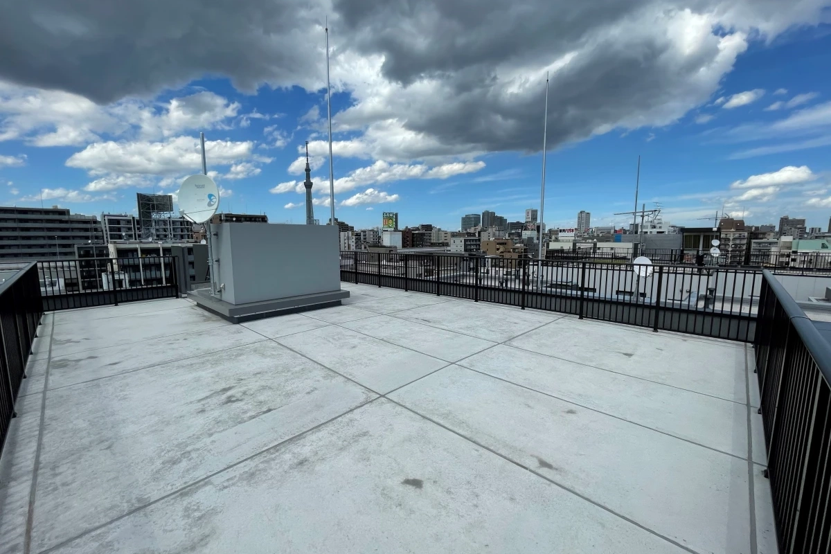7階建ての自社ビルに屋上もございます。高い建物が少ないので開けた景色で、スカイツリーがバッチリ望めるロケーションが自慢です。無骨なアンテナや無機質なコンクリの床など雰囲気もありますので、アパレル系の広告撮影におすすめです。また墨田区の下町を感じられる背景を活かした、ドラマ撮影のロケとしてもぜひご利用くださいませ。