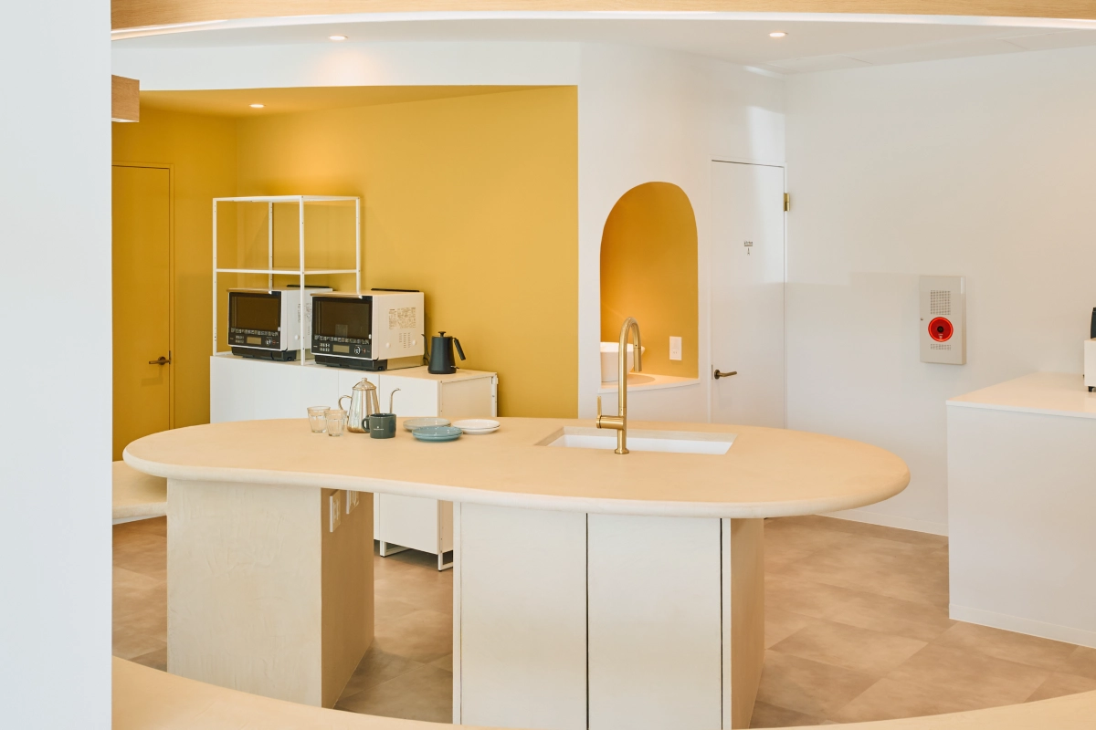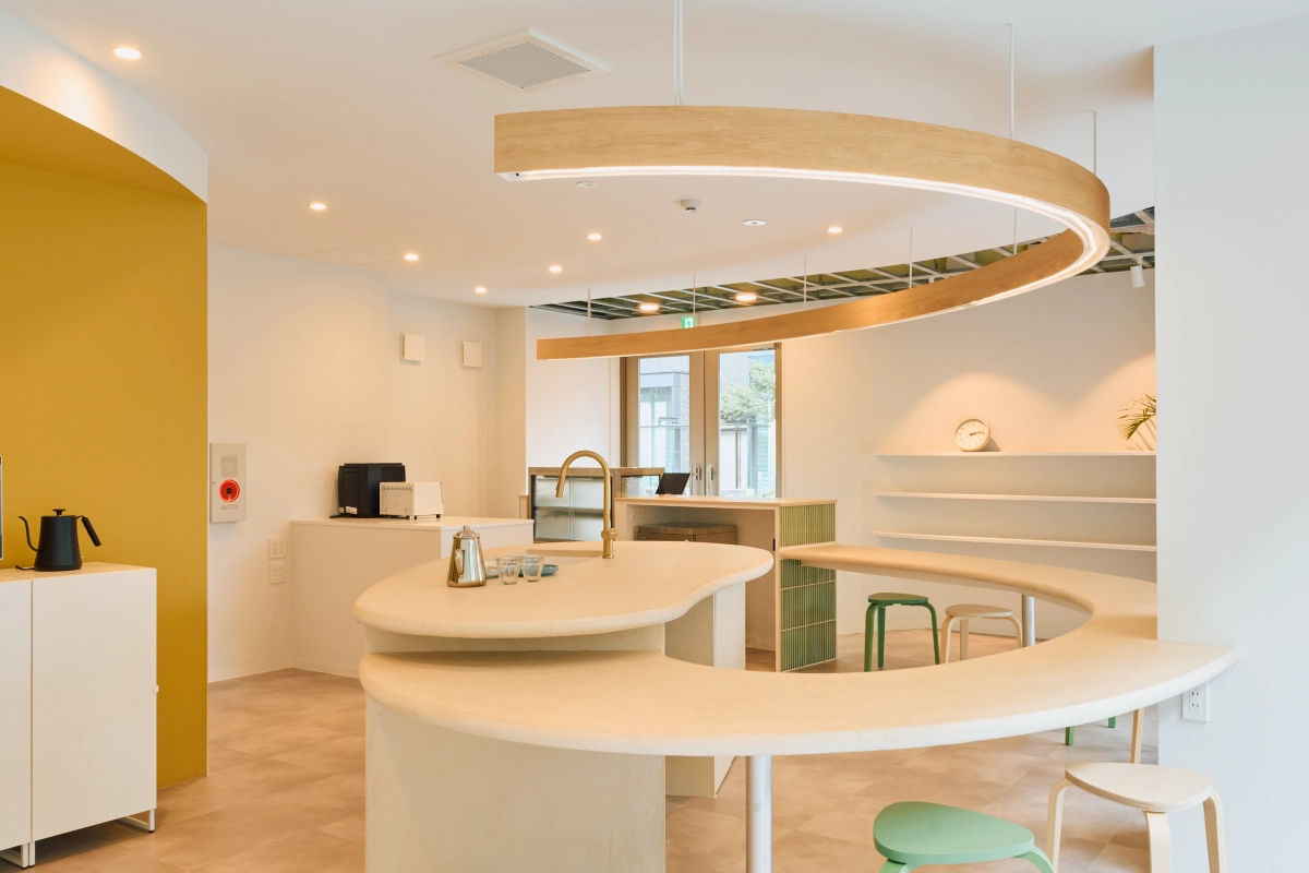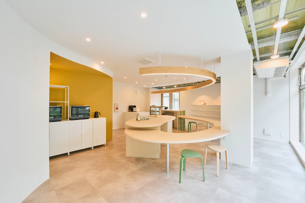 自然光たっぷり入りこむガラス張りの開放的なオープンキッチンです。アイランド型キッチン、楕円型カウンターテーブル、冷蔵ショーケース、一槽シンク、コーヒーメーカー、オーブン、プロジェクターなどを完備しています。料理教室はもちろん、小規模なワークショップ・セミナーなどの会場としてご利用いただけます。