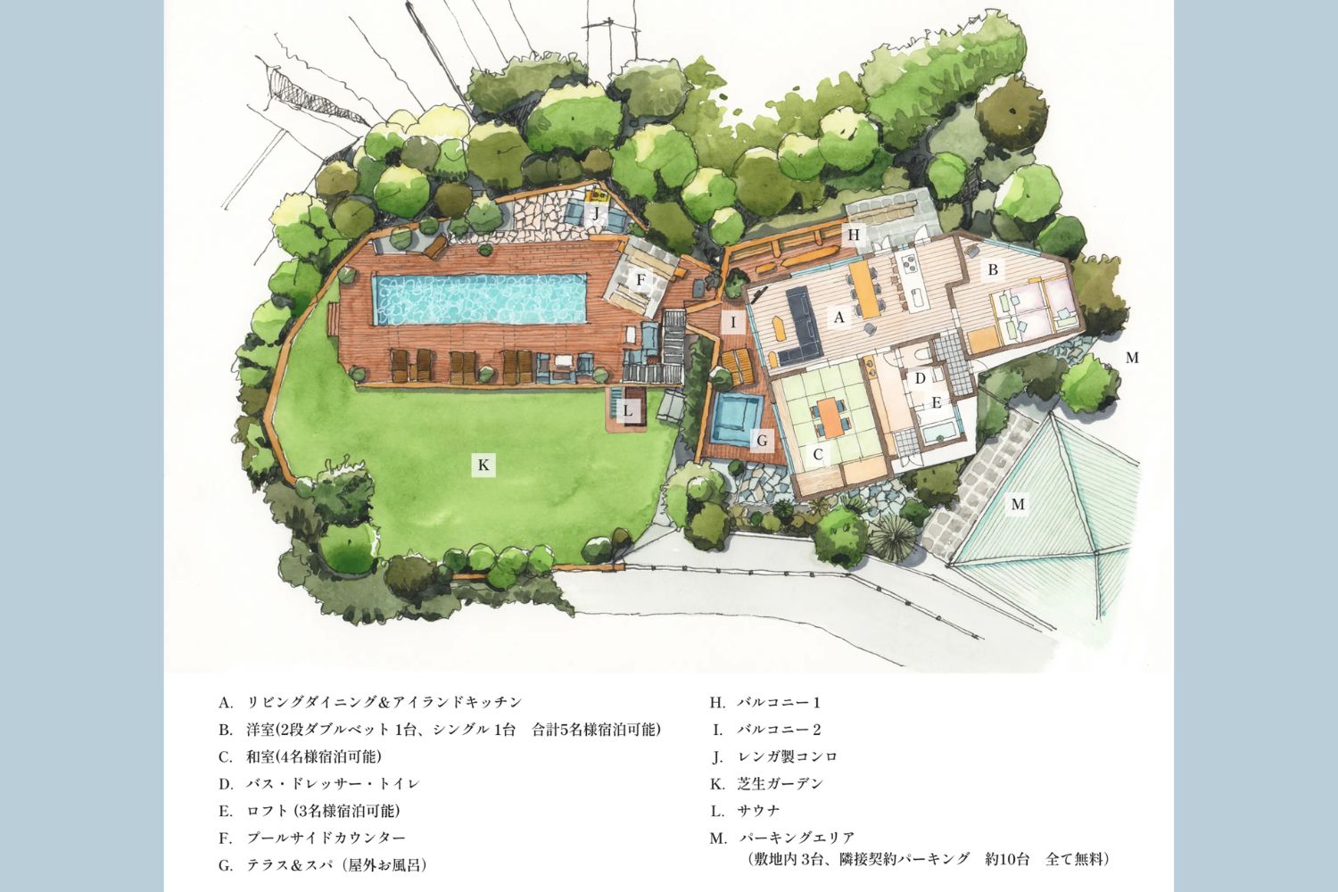 海と緑に囲まれた丘でのジャグジー&ガーデンプールが特徴的な個人住宅として使う別荘になります。生活に支障がない範囲で、積極的にロケ・撮影に貸出しております。木々に囲まれており、プライベートな空間が保たれるので、グラビア撮影や企業CMなどの撮影におすすめです。太平洋を眺めながらプールと、広い芝生ガーデンは他にはない唯一無二のロケーションになります。ドラマ、映画、CM、MV、グラビアなど撮影でぜひお使いください。