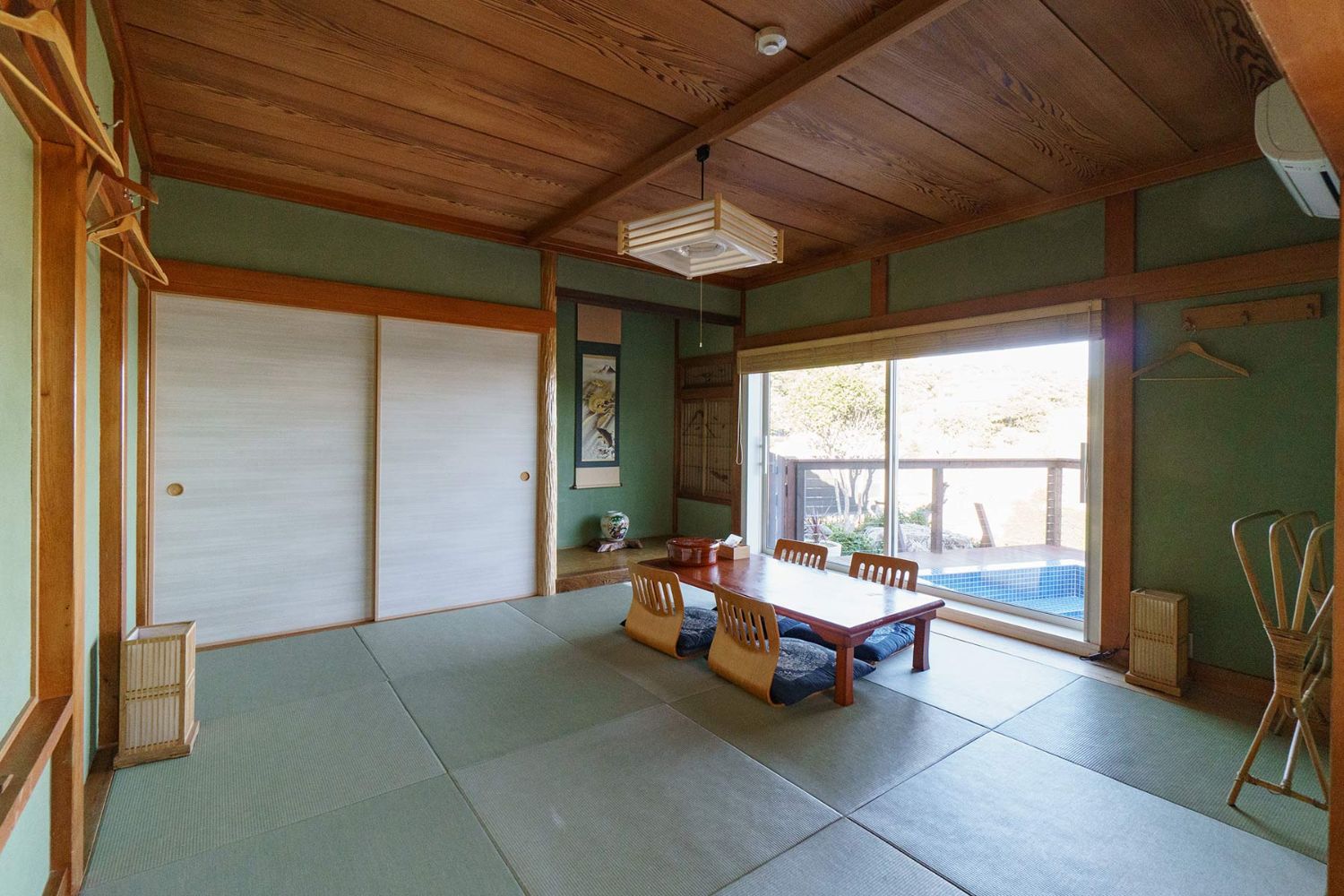 太平洋の水平線につながるインフィニティラインの一望できる15mの大型プールがあります。プールサイドも充実しており、ウッドデッキやカウンターなど大人数対応できる広々空間になっています。また室内からも太平洋を眺められます。さらにくつろげる和室もご用意しており、室内外ともに多彩なバリエーション撮影ができます。普通だと断られるプール利用や撮影などもお気軽にご相談ください。