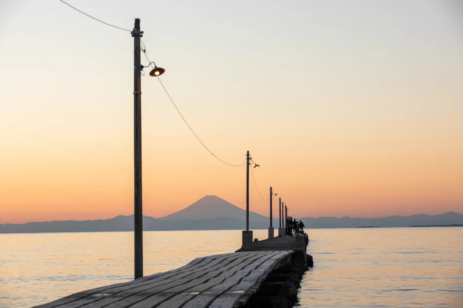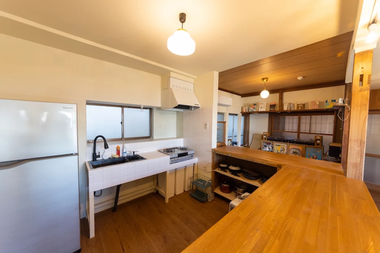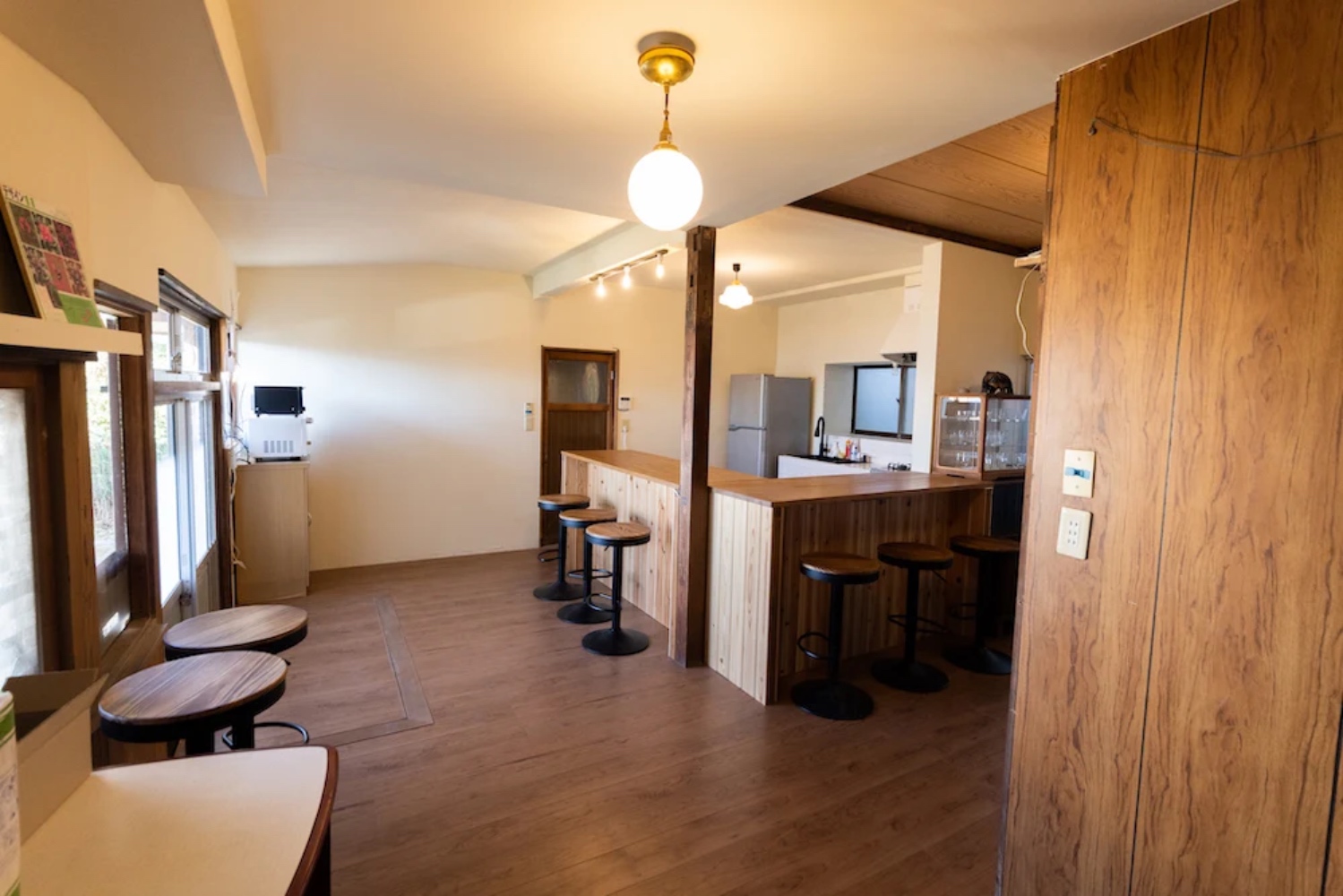 内房の穏やかな海を臨む、富浦の原岡桟橋近くの一棟貸別荘です。間取りは4LDK。L字カウンターが特徴的な18畳のオープンキッチン。さらに合計14畳の広々とした和室。2階は階段を上ると原岡海岸が眺望できる踊り場、8畳の和室と6畳のフローリングのベッドルーム。カウンターキッチンでお食事とともに盛り上がりながら、お休みは1階和室と2階とに二組(男女、家族)に分かれてのご利用も可能。特に2階は静かで優雅な時間をお過ごしいただけます。地元の新鮮な食材で料理したり、語り合ったり。タイミングが合えば、桟橋越しの夕陽と富士山にも出会えます。