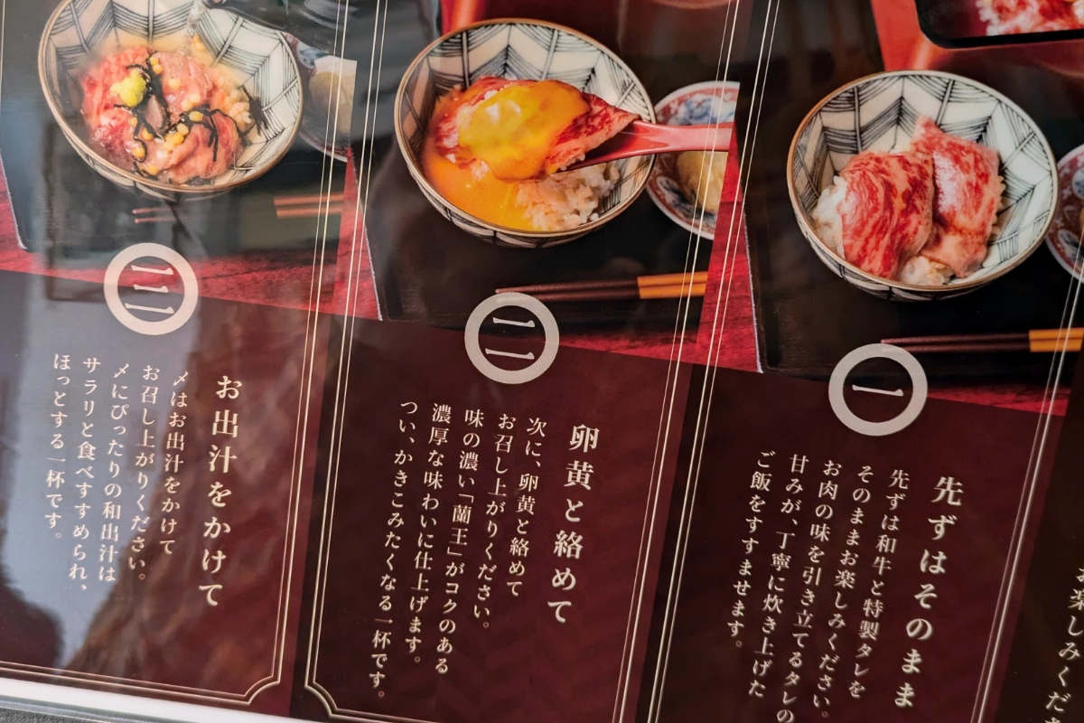全国の銘柄和牛からの厳選部位、米マイスターが選んだ国産米とミネラルの豊富な卵黄が特徴の卵「蘭王」にもこだわり、和牛本来の美味しさと記憶残る空間を楽しめる店内にて、、一度に3パターンの食べ方を楽しめるこだわりの和牛レアステーキ重の専門店です。