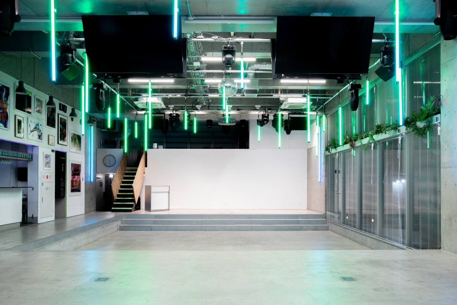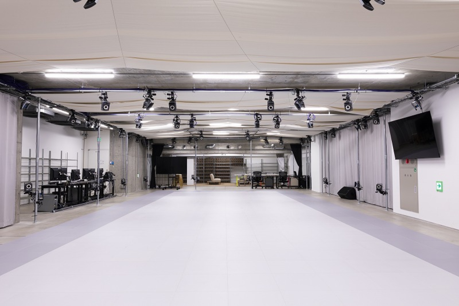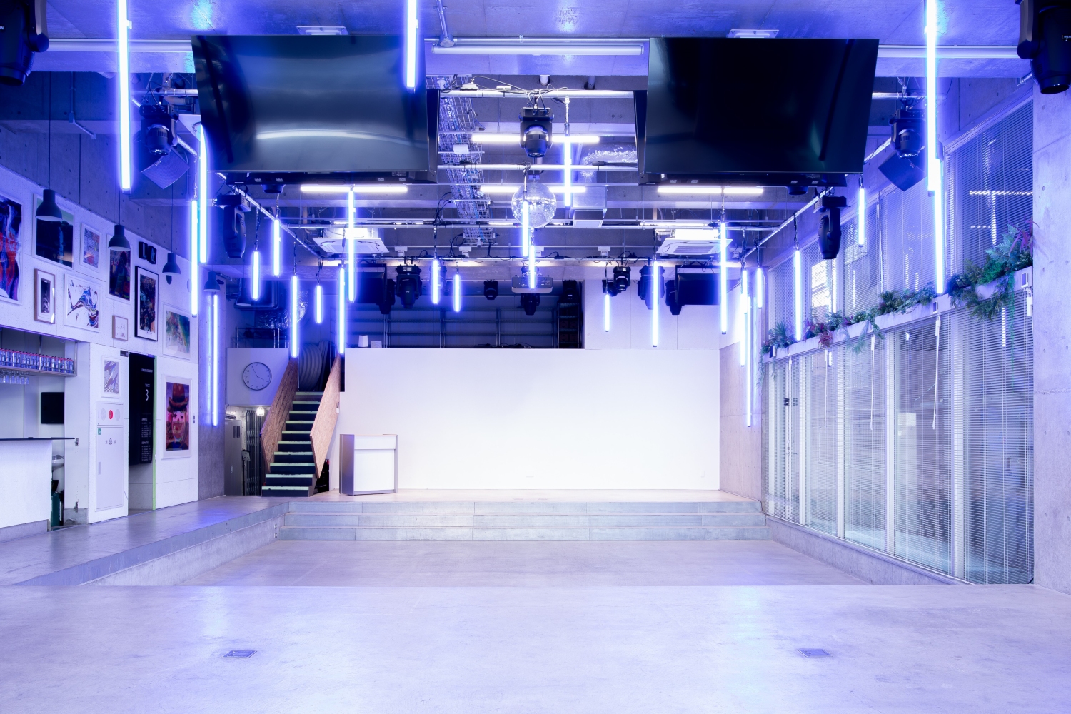 撮影・イベント・ロケ・ライブなどあらゆる用途で使える多目的スペースになります。230平米で300名(立席)・200名(着席)を収容できるキャパを誇ります。大型モニターだけでなく、本格的なPA・照明・配信設備を整えており、大規模な生配信や番組収録でも対応できます。美術や建て込みも自由自在に行えるので、映画、ドラマ、CM、MVなどの大掛かりなシーン撮影でもぜひご利用ください!ライブハウス、クラブ、ダンス対決、記者会見など多彩シチュエーションを撮ることができます。