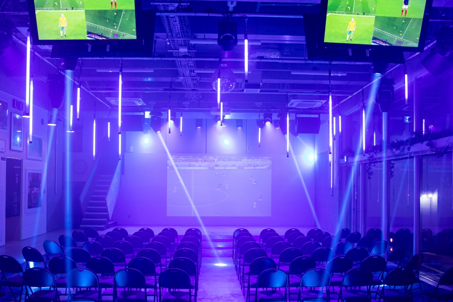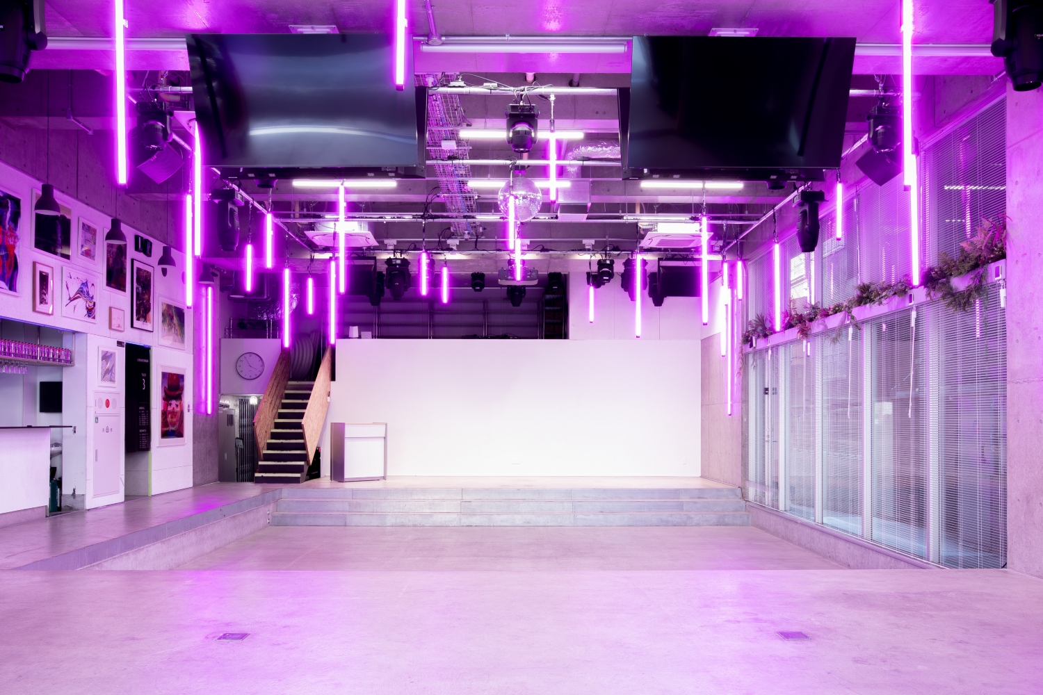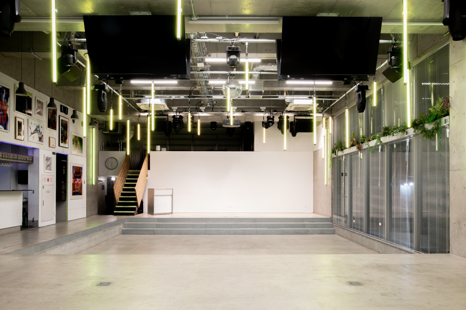撮影・イベント・ロケ・ライブなどあらゆる用途で使える多目的スペースになります。230平米で300名(立席)・200名(着席)を収容できるキャパを誇ります。大型モニターだけでなく、本格的なPA・照明・配信設備を整えており、大規模な生配信や番組収録でも対応できます。美術や建て込みも自由自在に行えるので、映画、ドラマ、CM、MVなどの大掛かりなシーン撮影でもぜひご利用ください!ライブハウス、クラブ、ダンス対決、記者会見など多彩シチュエーションを撮ることができます。