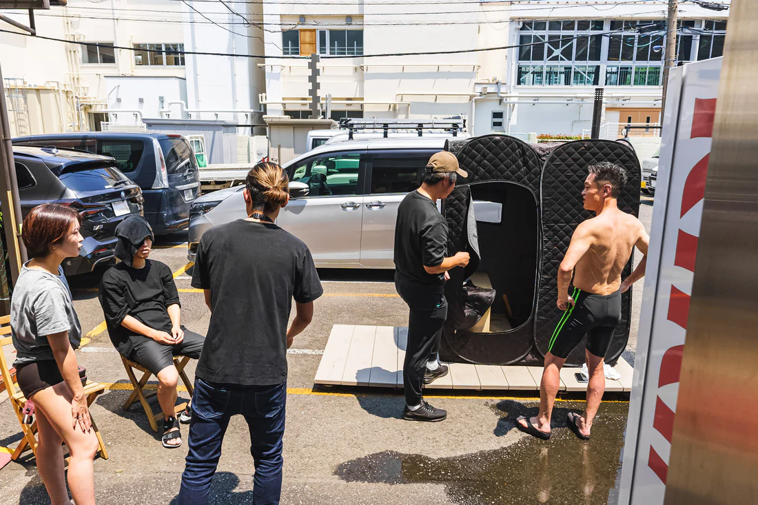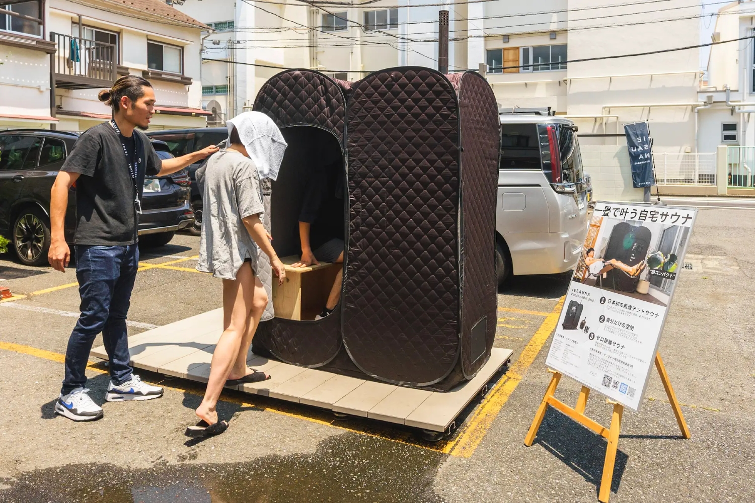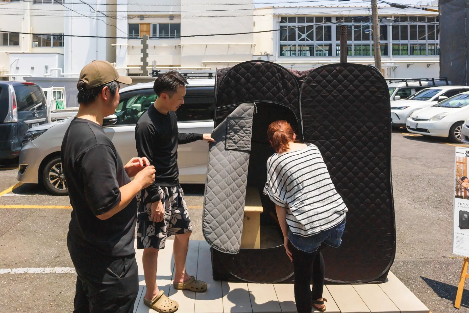 IESAUNAを無料体験できる会場を全国にご用意しています。現在は千葉県船橋市、神奈川県相模原市、愛知県豊橋市、岐阜県関市、福岡県福岡市で開催しております。自宅サウナを体験する企画や取材も可能です。さらに、普段と異なる街ブラ番組の寄り道でもおすすめです。サウナ店舗に行くのではなく、購入できるユニークな商品として、取り上げてみてもきっと面白いと思います。体験会場への取材・撮影もお気軽にお問い合わせください。