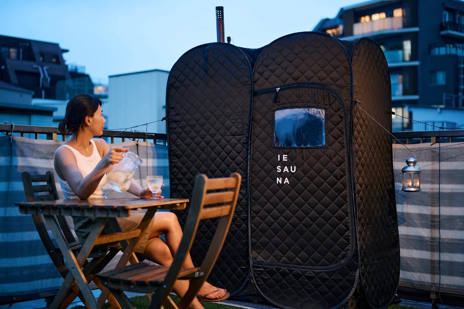 自宅・家庭用サウナならIESAUNA 。 都会のマンションのベランダでも使える、工事いらずの家庭用サウナ。自宅でプライベートに、好きなタイミングでロウリュウする贅沢な時間。思い立ったらすぐにサウナが出来る。そんな夢をかなえるのが、 2 年間の試行錯誤を経て遂に完成したのが「IESAUNA」です。