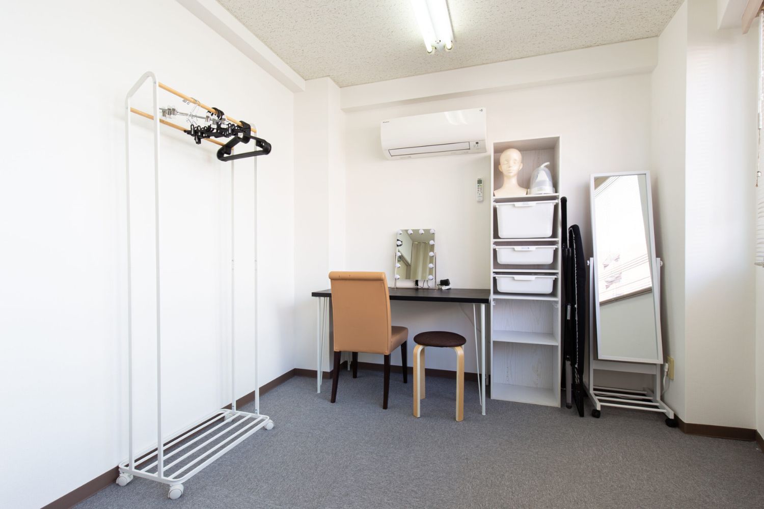 テーブル&椅子の揃った明るい 北欧風インテリアの控室と、ソファーの揃った落ち着いたミッドセンチュリー風の控室を完備しております。ドレッサー3席と更衣スペースをそれぞれ備えついており、楽屋・控室としてご利用いただけます。またシーン撮影などのスペースとしても、利用可能になりますので、楽屋・控室のシーン撮影にもおすすめです。お気軽にご相談ください。