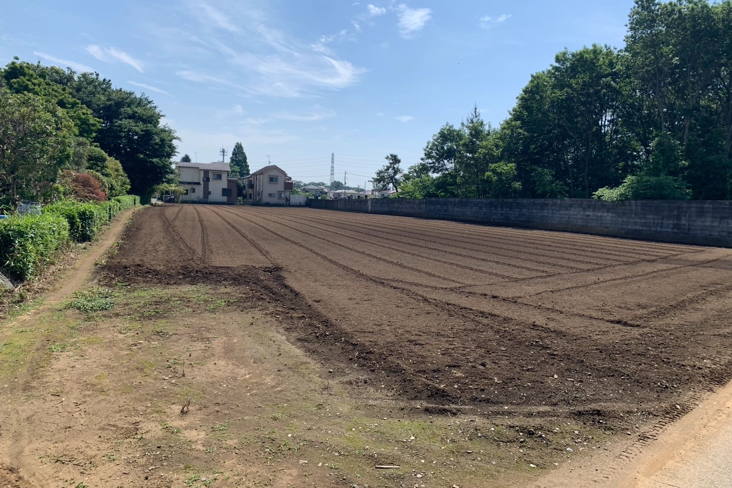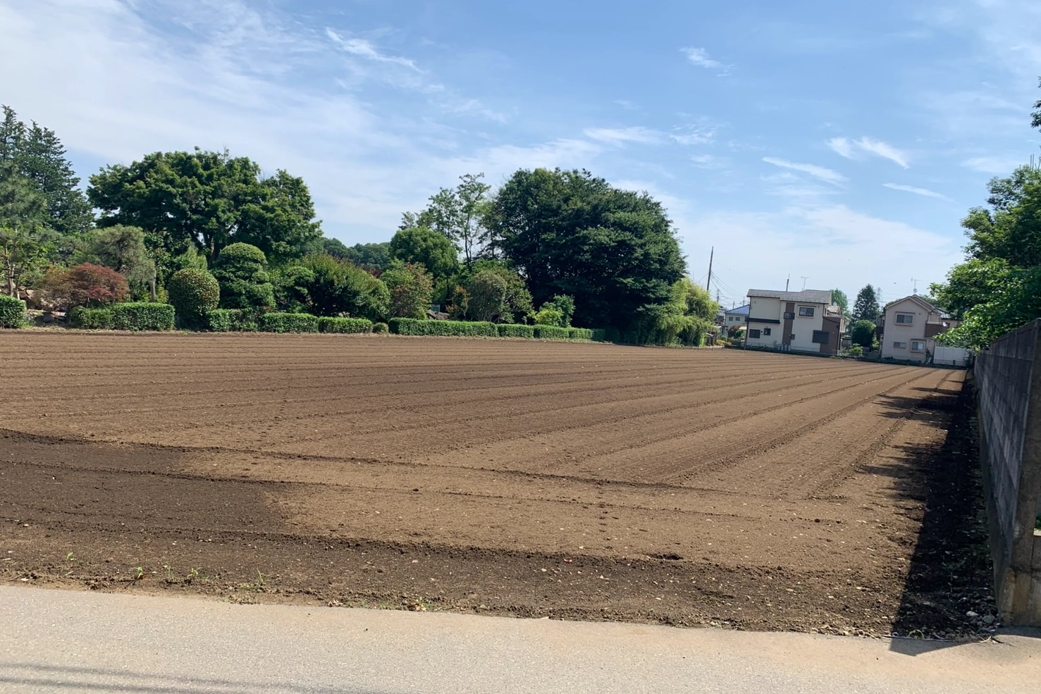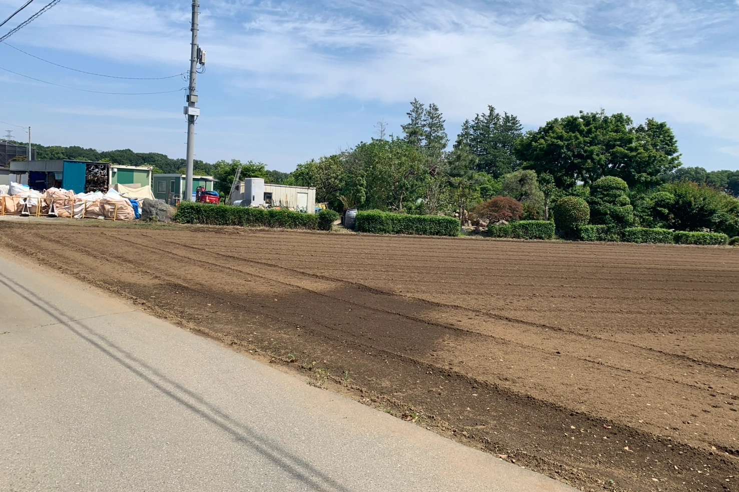 一輪車や鉄骨パイプが置かれるプレハブと広い畑を兼ね備える造園会社