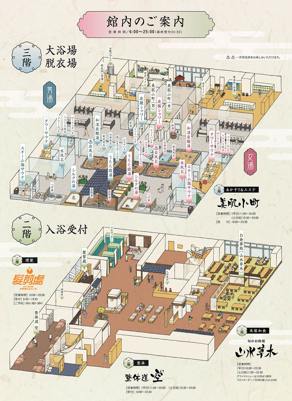 東海道五十三次の宿場をモチーフにしたスーパー銭湯です。15種類のお風呂、3種類のサウナだけでなく、お食事処、ほぐし処なども併設しており、おひとりでもご家族連れでも誰でも楽しめます。お客様や営業に支障がない範囲で、取材・撮影・ロケなど積極的に協力しております。物価高騰や節約などの報道取材から、スーパー銭湯を紹介する情報バラエティなど幅広くご相談くださいませ。また営業時間外、定休日を活用し、ドラマ、映画、CMなどのシーン撮影のロケ地としても貸出しております。スーパー銭湯の撮影・取材にお困りになりましたら、お気軽にご相談ください。