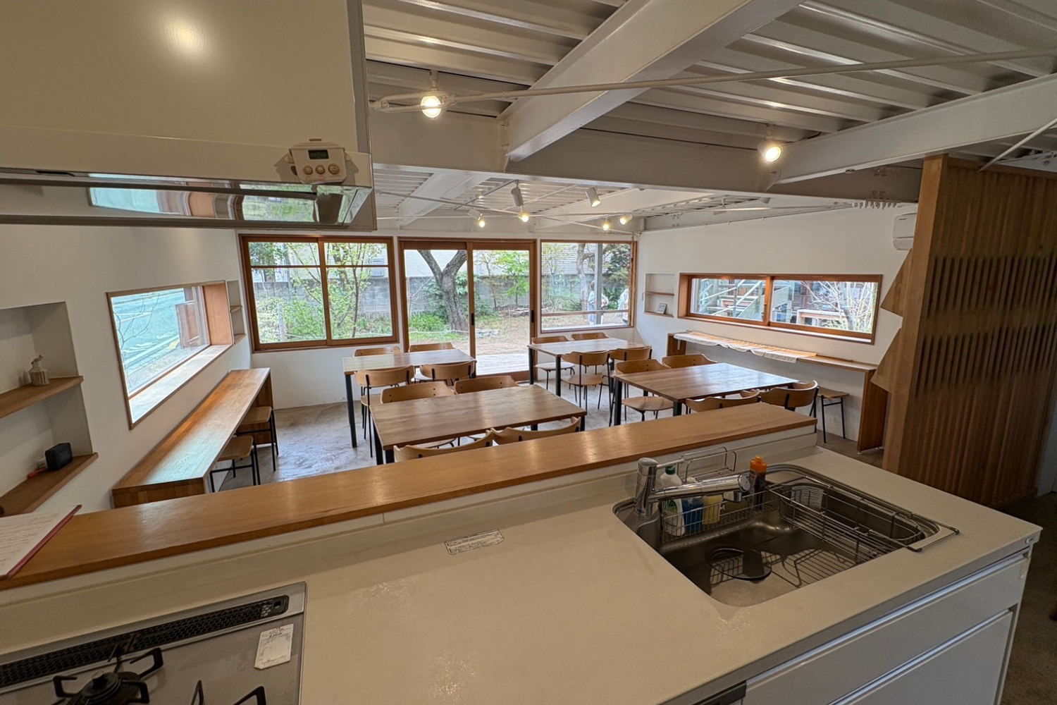 飲食店・菓子製造の許可を持つレンタルキッチンスペースです。こちらも撮影のロケ地として貸出しております。木の温もりある室内スペースと、広々調理場は、カフェやレストランのシチュエーションにピッタリです。ゆったりとした時間が流れ、レンタルスペースをぜひご利用ください。