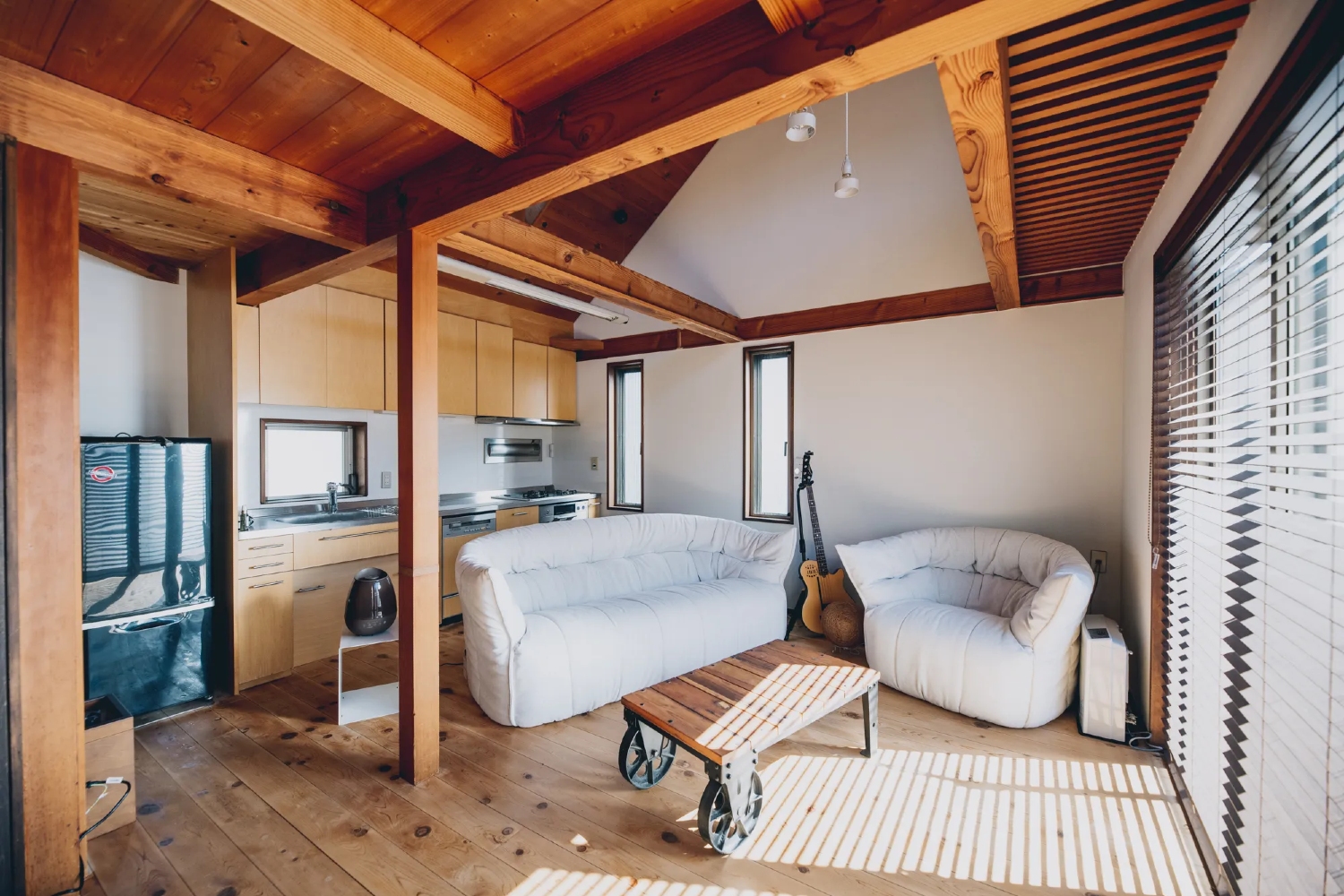 広々としたリビングは、温もりと洗練されたデザインが調和する空間です。木製の天井が自然なぬくもりを引き立て、大きな窓からはたっぷりと自然光が差し込みます。あらゆるシーンに対応できる自由なレイアウトが可能で、ファミリーシーンやホリデーシーンの撮影にもぴったりです。