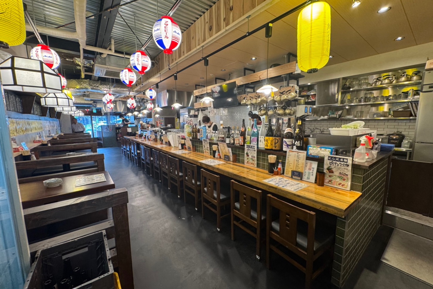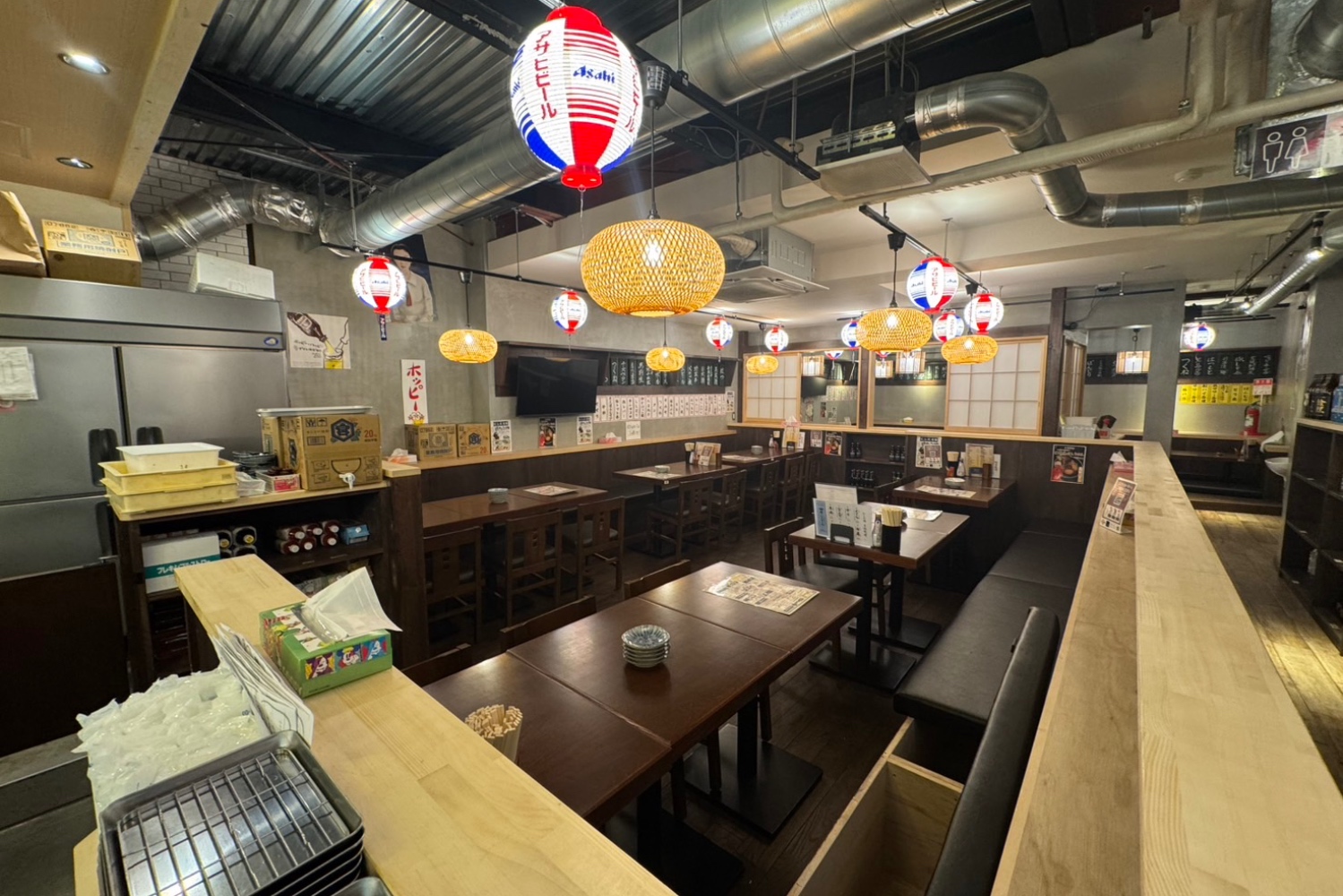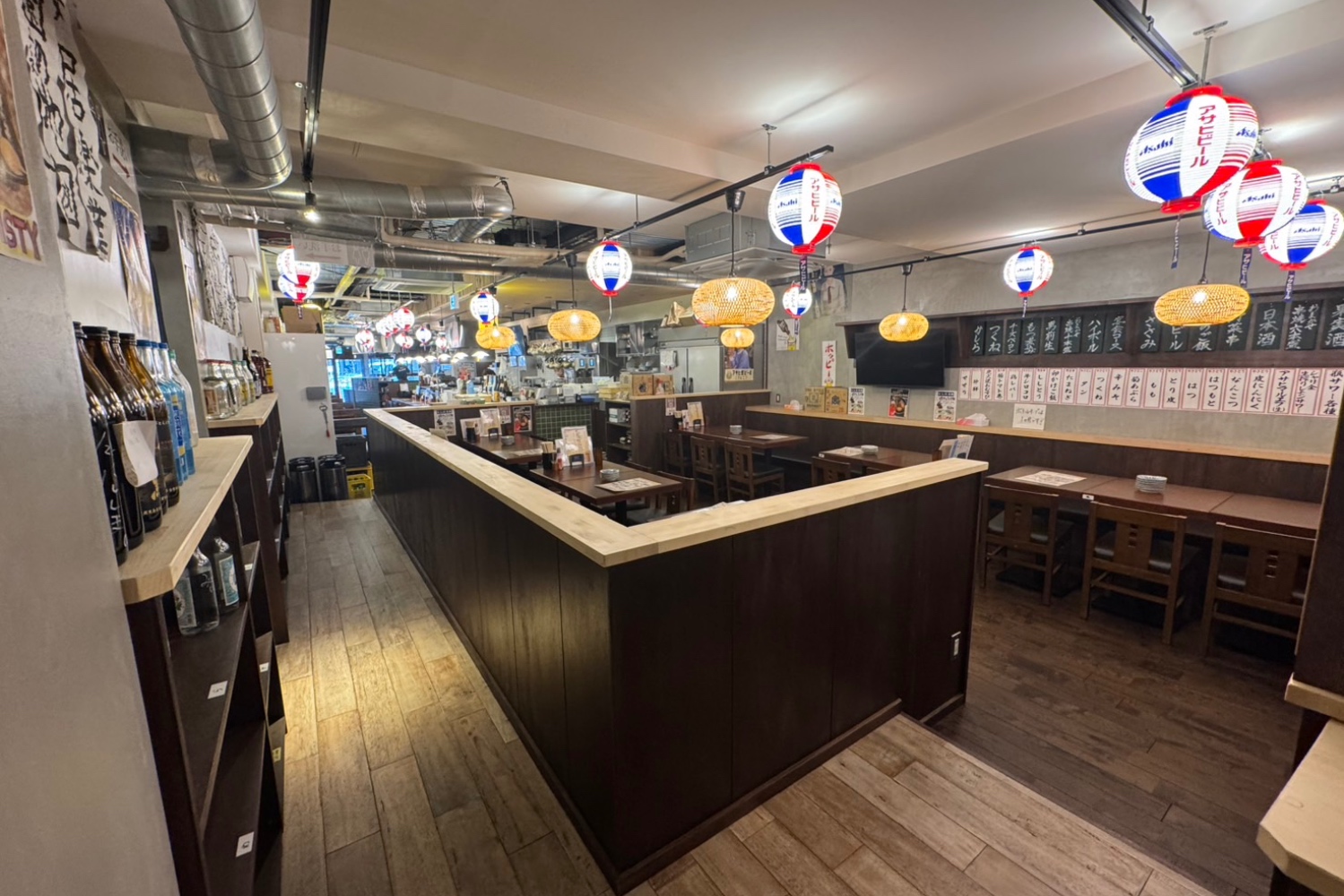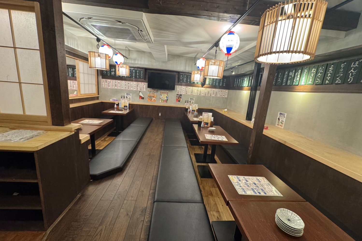 お店の目印にもなっている大きな提灯。紺色ののれんをくぐると、焼き場やショーケースが見られるカウンター席!店内奥には、ずらりと並んだお座敷席がございます!小宴会から大宴会までご利用いただけます。