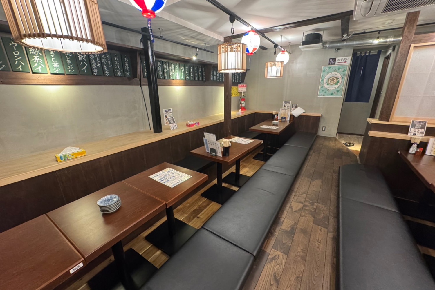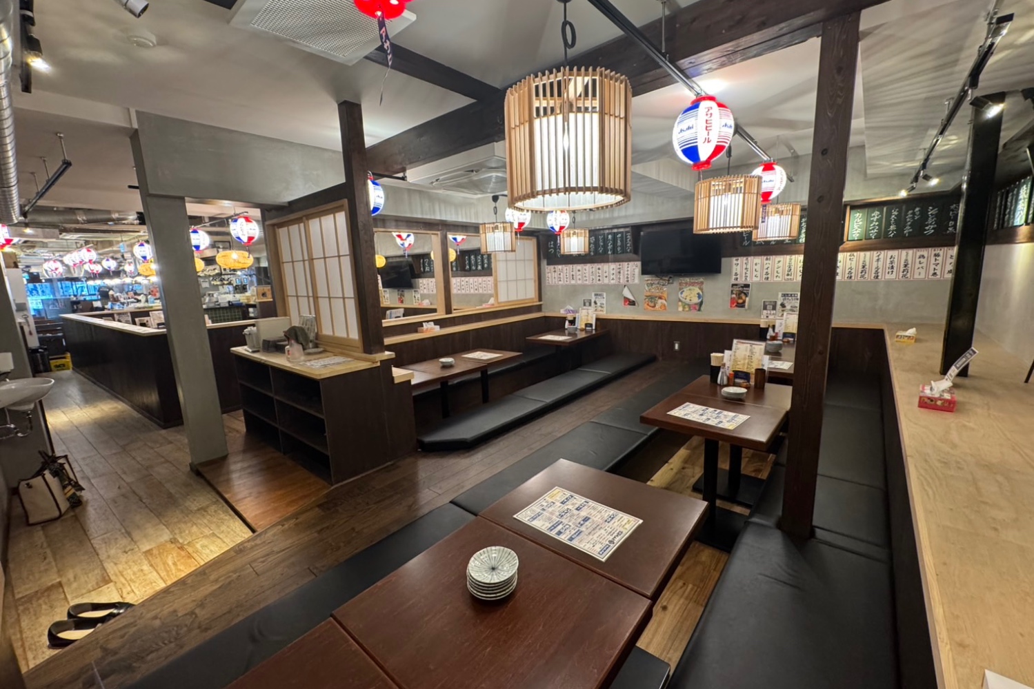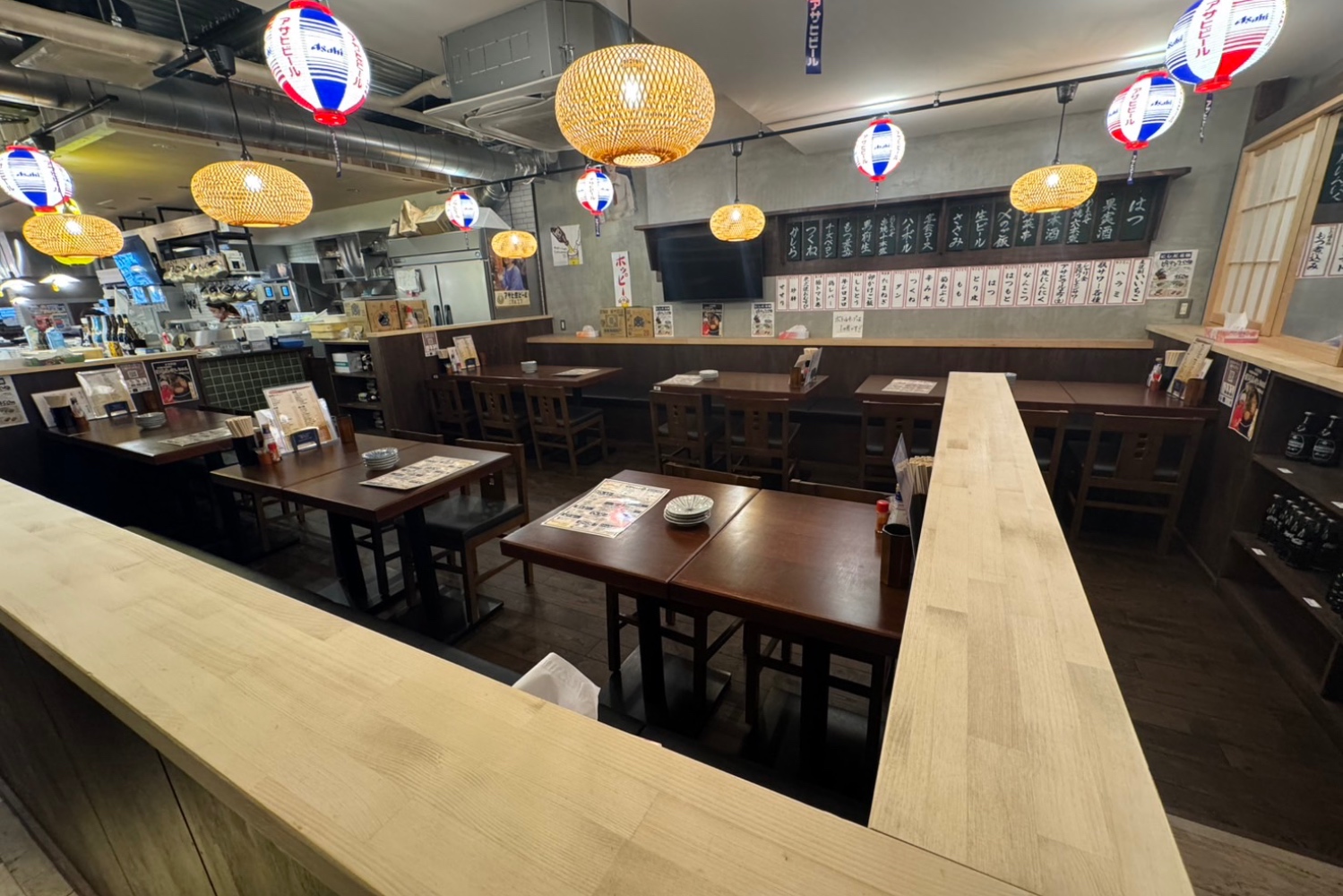 お店の目印にもなっている大きな提灯。紺色ののれんをくぐると、焼き場やショーケースが見られるカウンター席!店内奥には、ずらりと並んだお座敷席がございます!小宴会から大宴会までご利用いただけます。