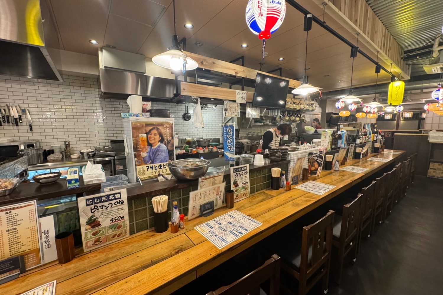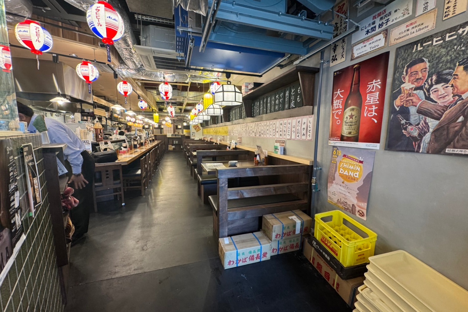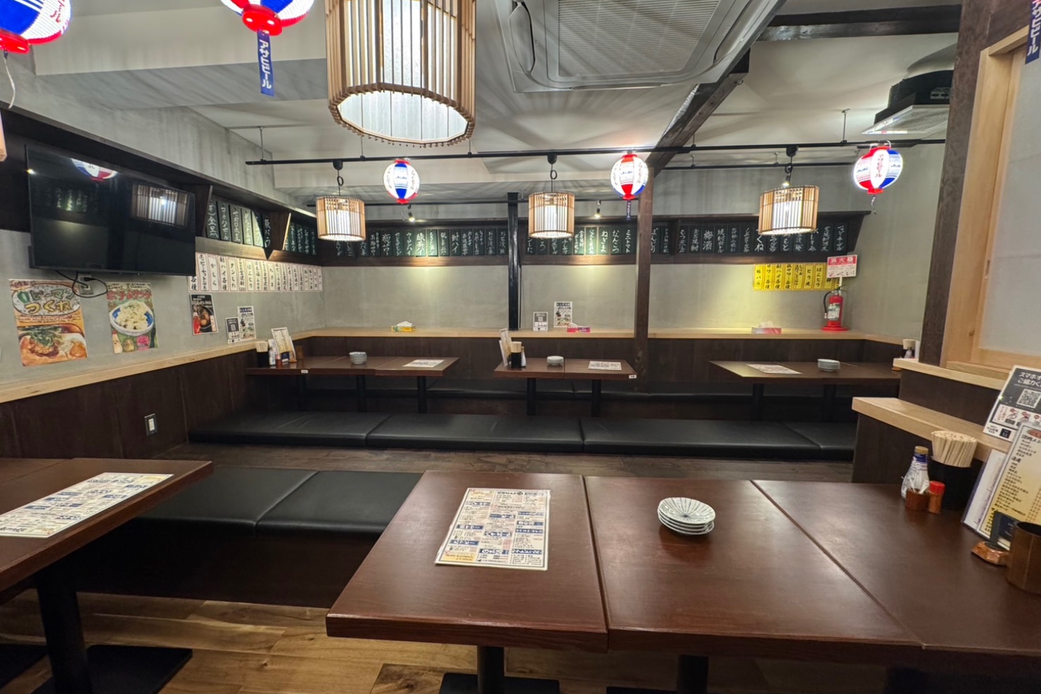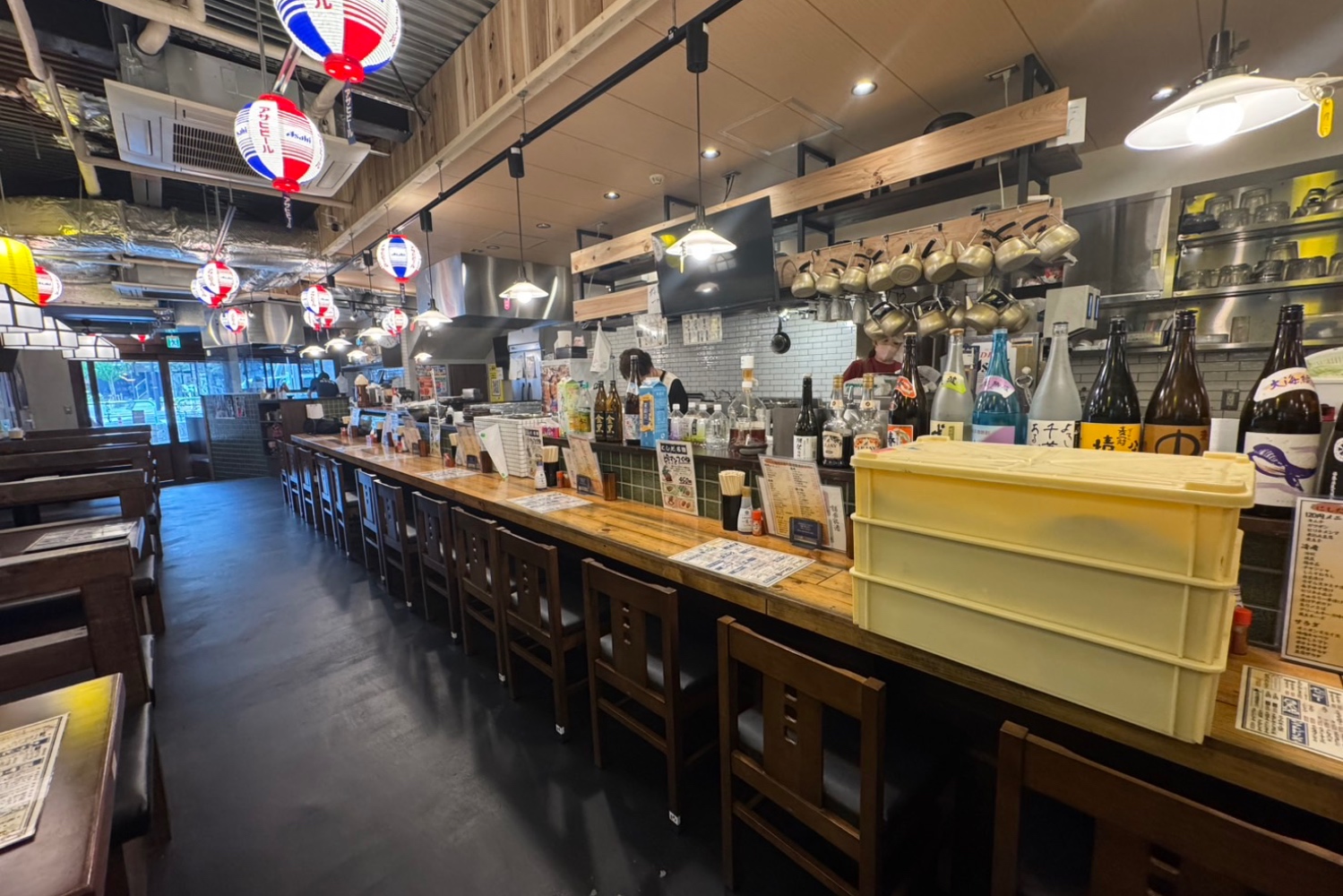 お店の目印にもなっている大きな提灯。紺色ののれんをくぐると、焼き場やショーケースが見られるカウンター席!店内奥には、ずらりと並んだお座敷席がございます!小宴会から大宴会までご利用いただけます。
