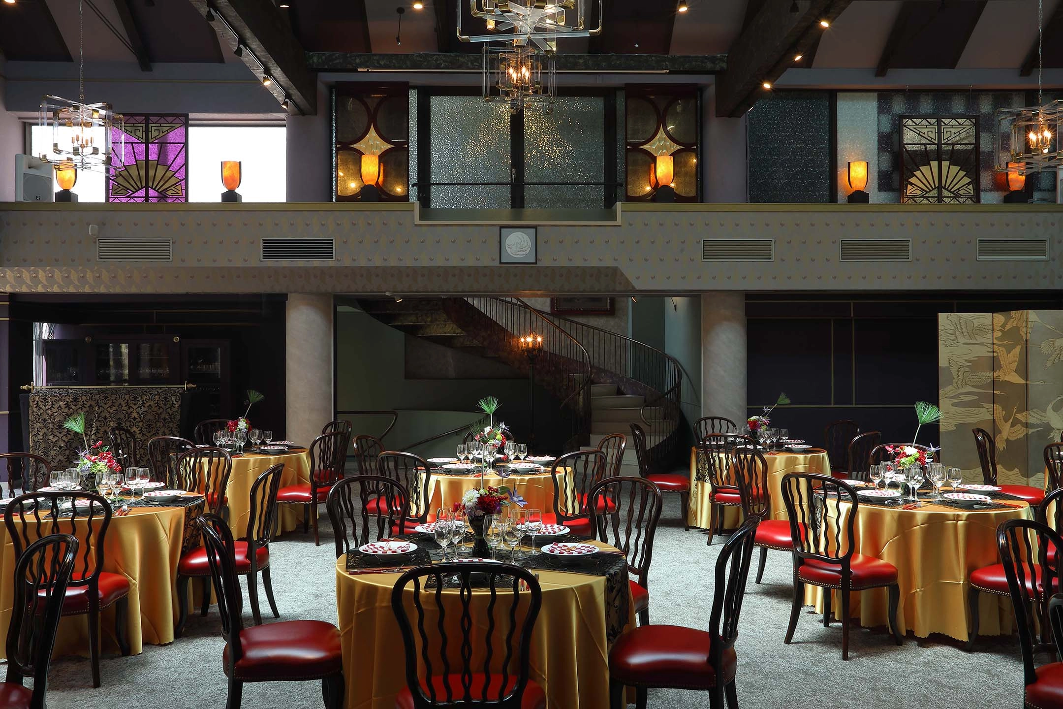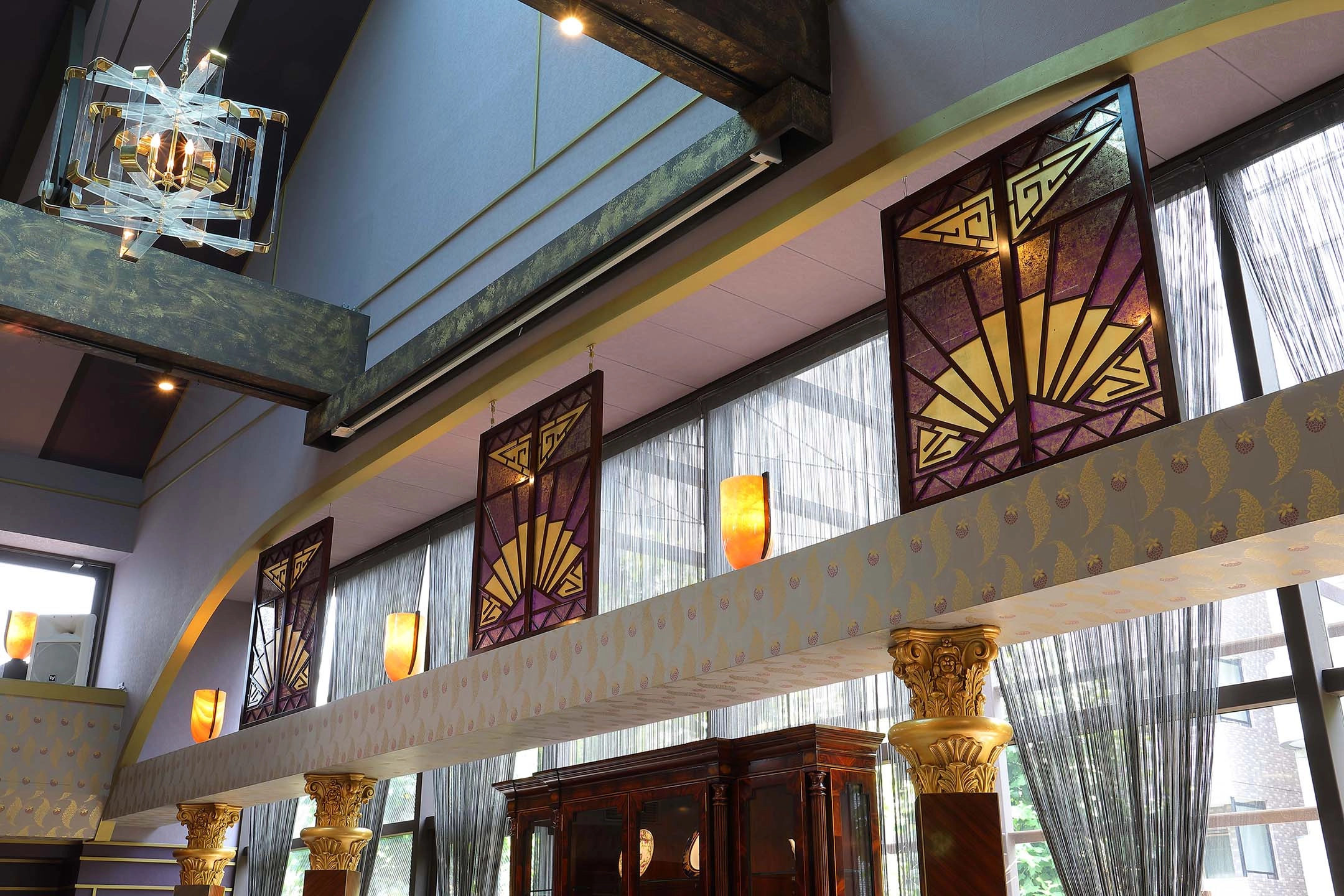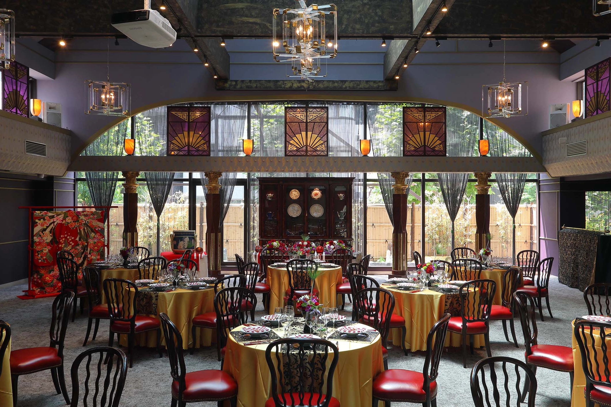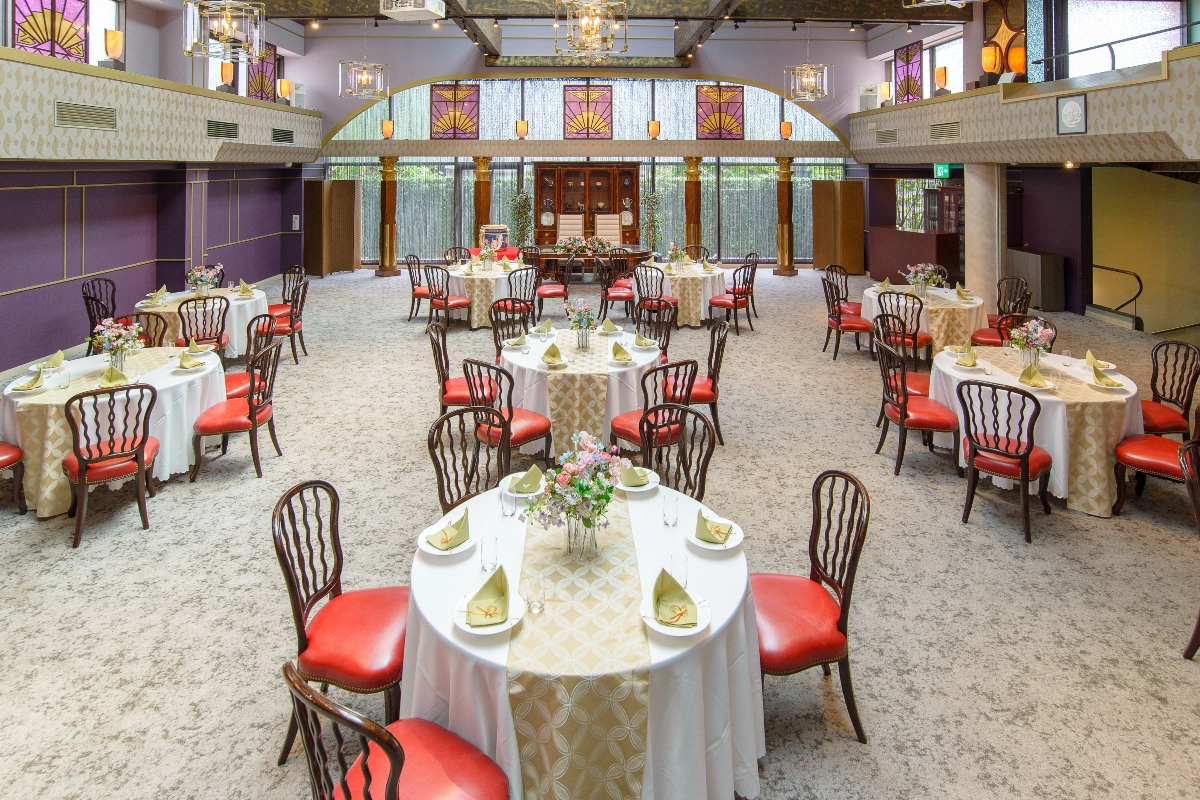 吹き抜けの天井と大きな窓から自然光が降り注ぐ開放感溢れる大空間が自慢の一軒家タイプのメインダイニングは、アールデコを基調に和の趣を採り入れた和魂洋才のモダニズムと自然素材、インダストリアルを融合した印象深い空間が特徴の披露宴会場です。