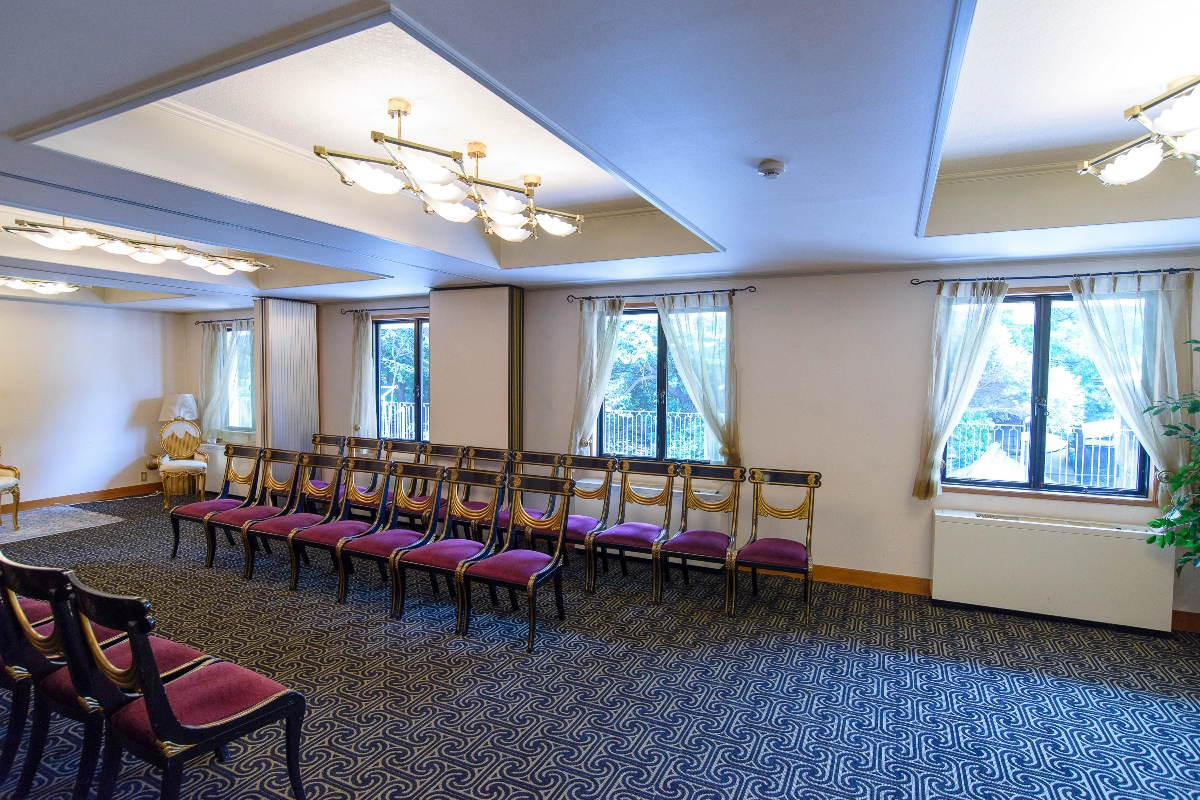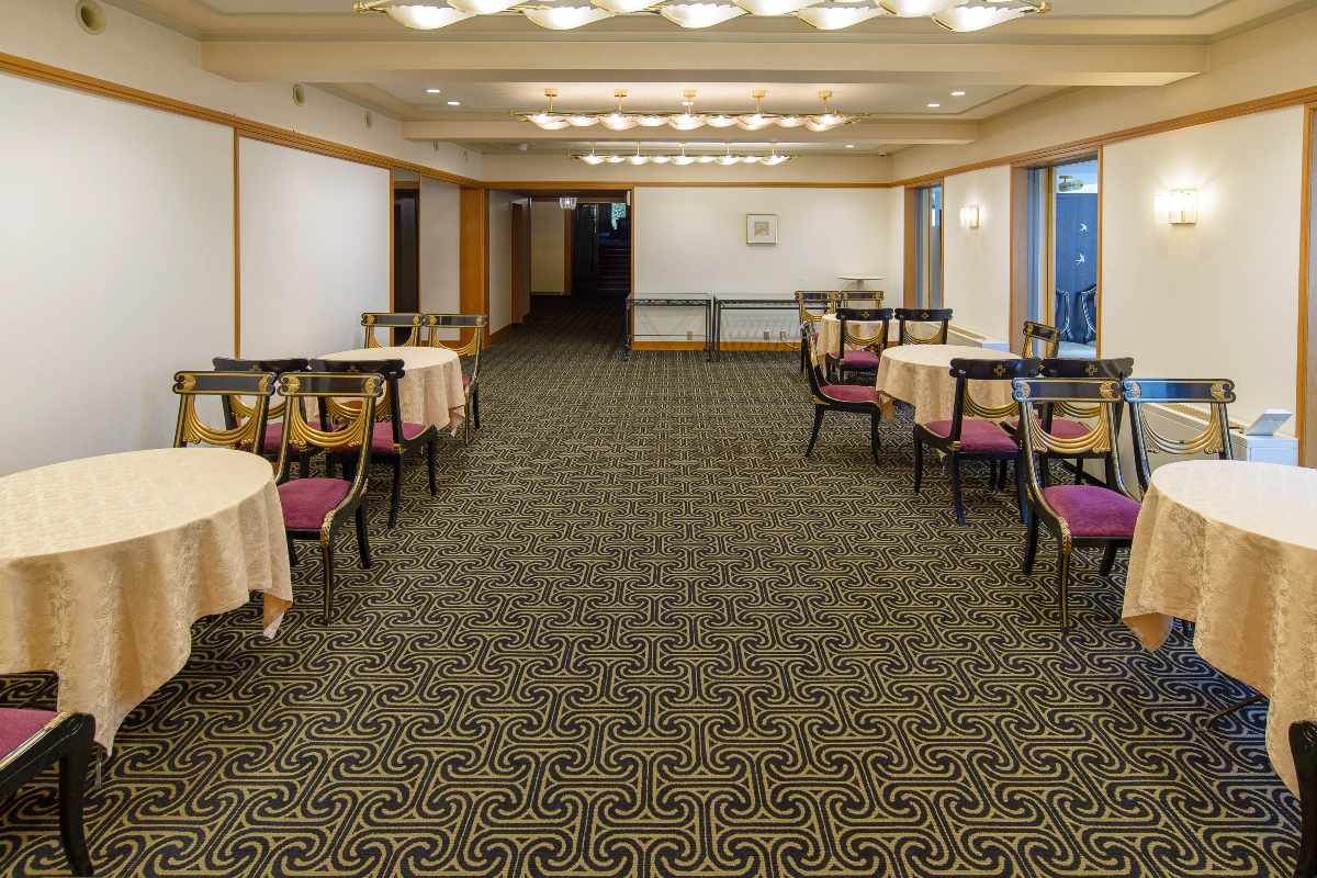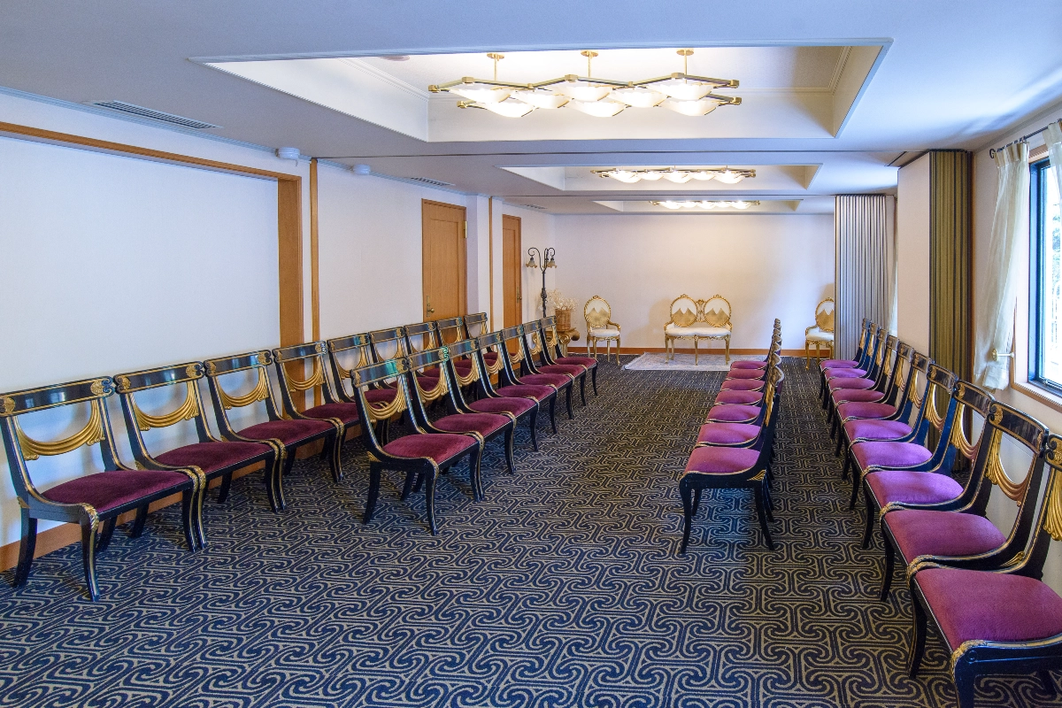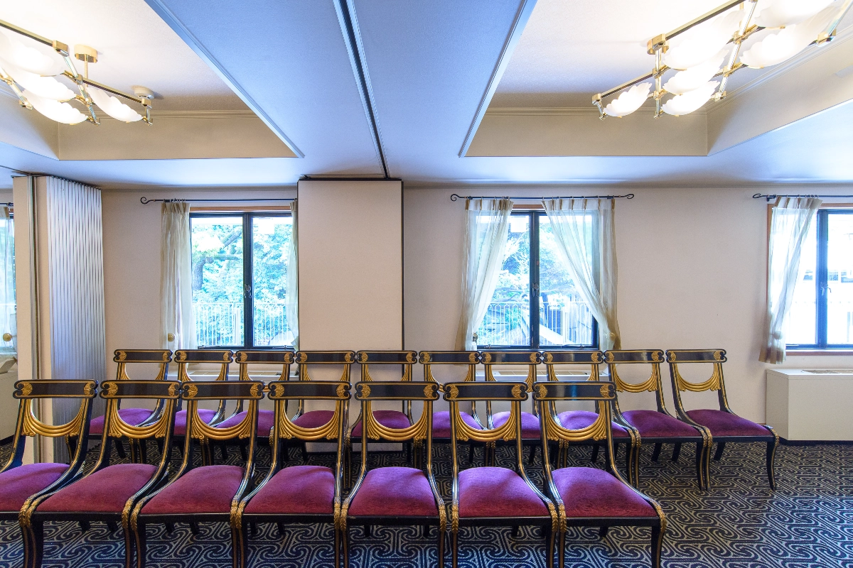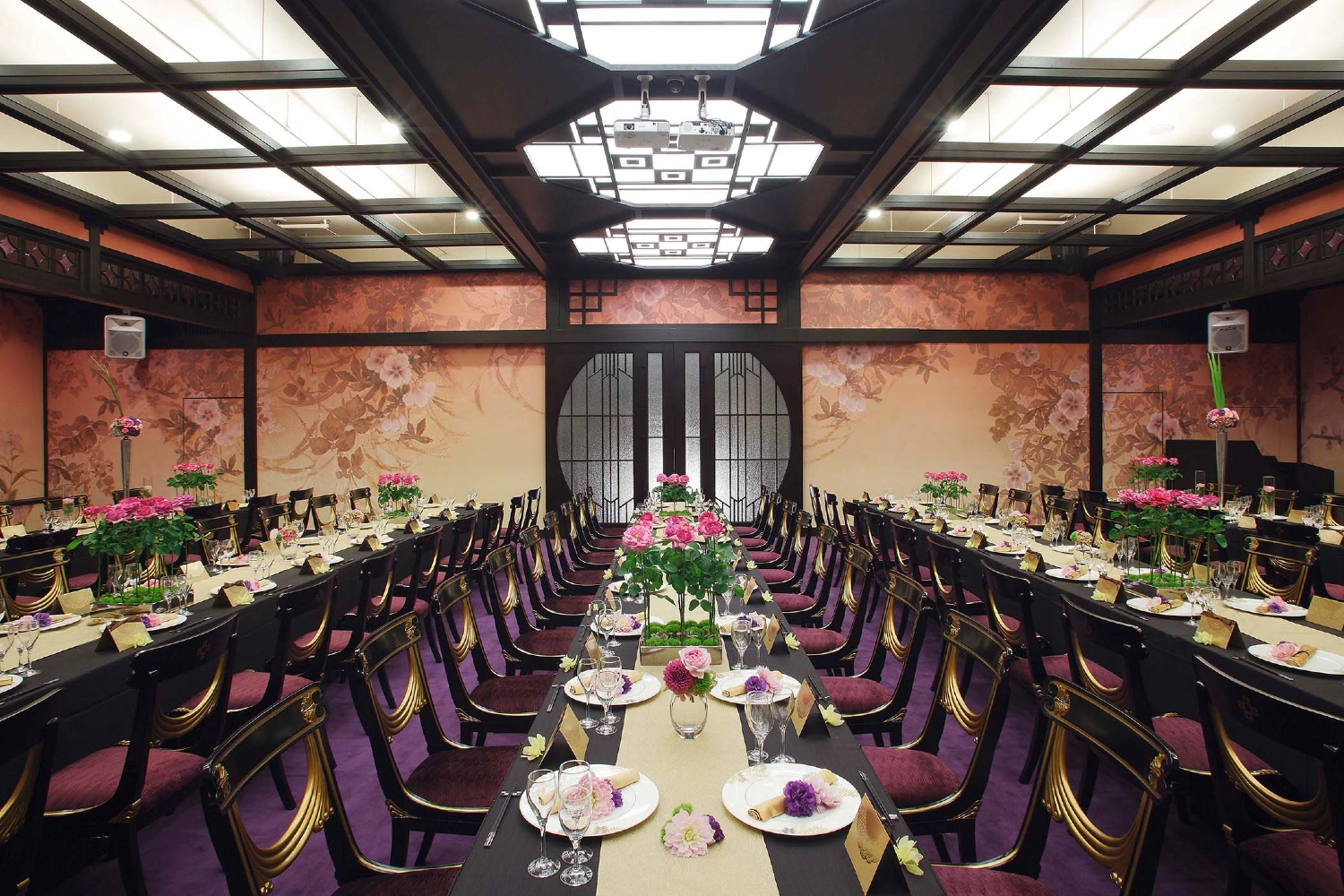 「和魂洋才」を存分に表現し左右の大窓から、自然光を取り入れた爽快で特別感のある収容人数約150名の会場「豊明」。乃木會館で一番大きい会場になり、ドラマ、映画、CM、MVなどのシーン撮影から、バラエティ番組の収録スタジオ、対談場所としてご利用くださいませ。豪華絢爛な式場としてのシチュエーションにピッタリで、大規模なロケ・撮影におすすめです。会場への進む階段は、他にはないカットを狙えます。テーブルや椅子だけでなく、金屏風やカトラリーなどもそのままお貸出しています。休館日であれば、積極的に撮影対応を受け入れておりますので、お気軽にご相談くださいませ。