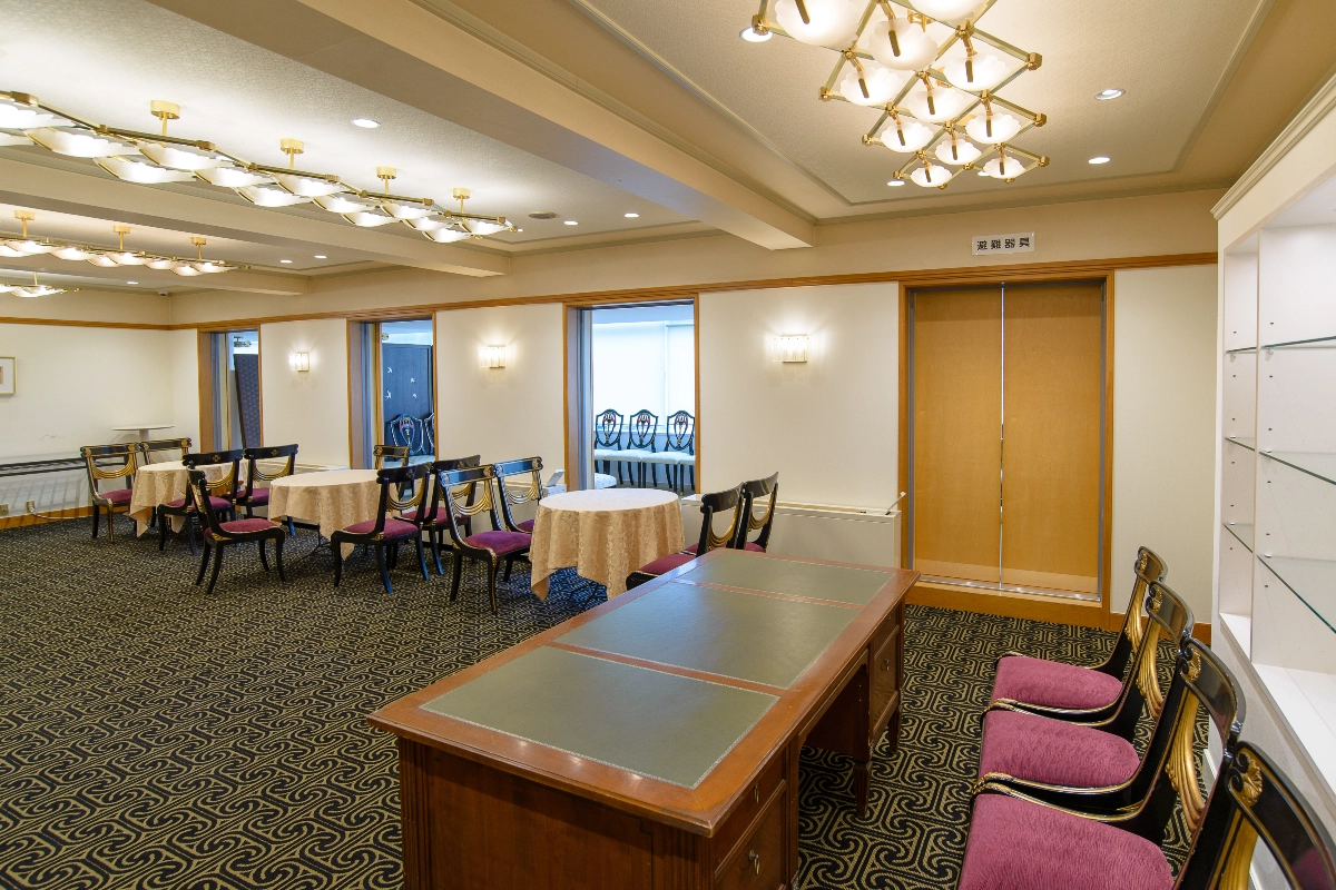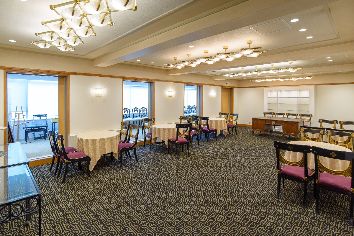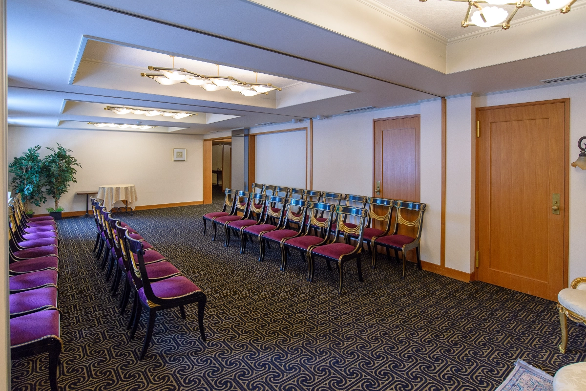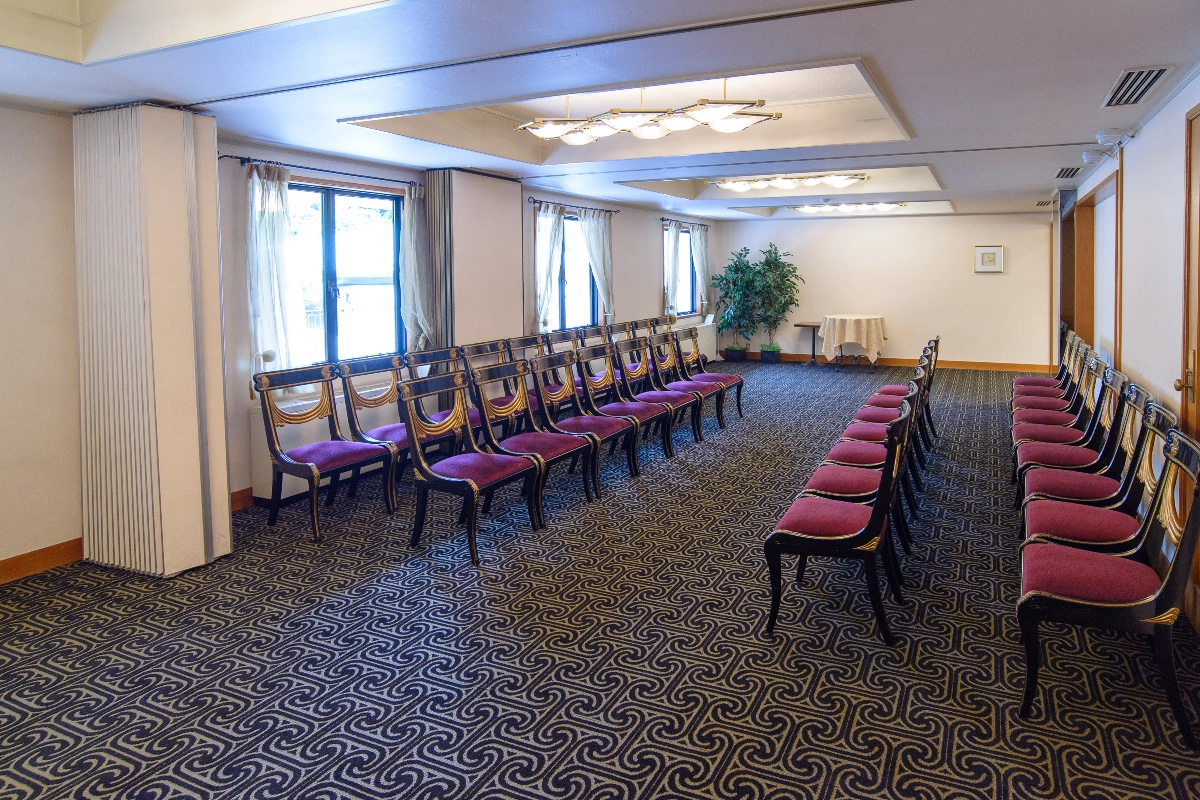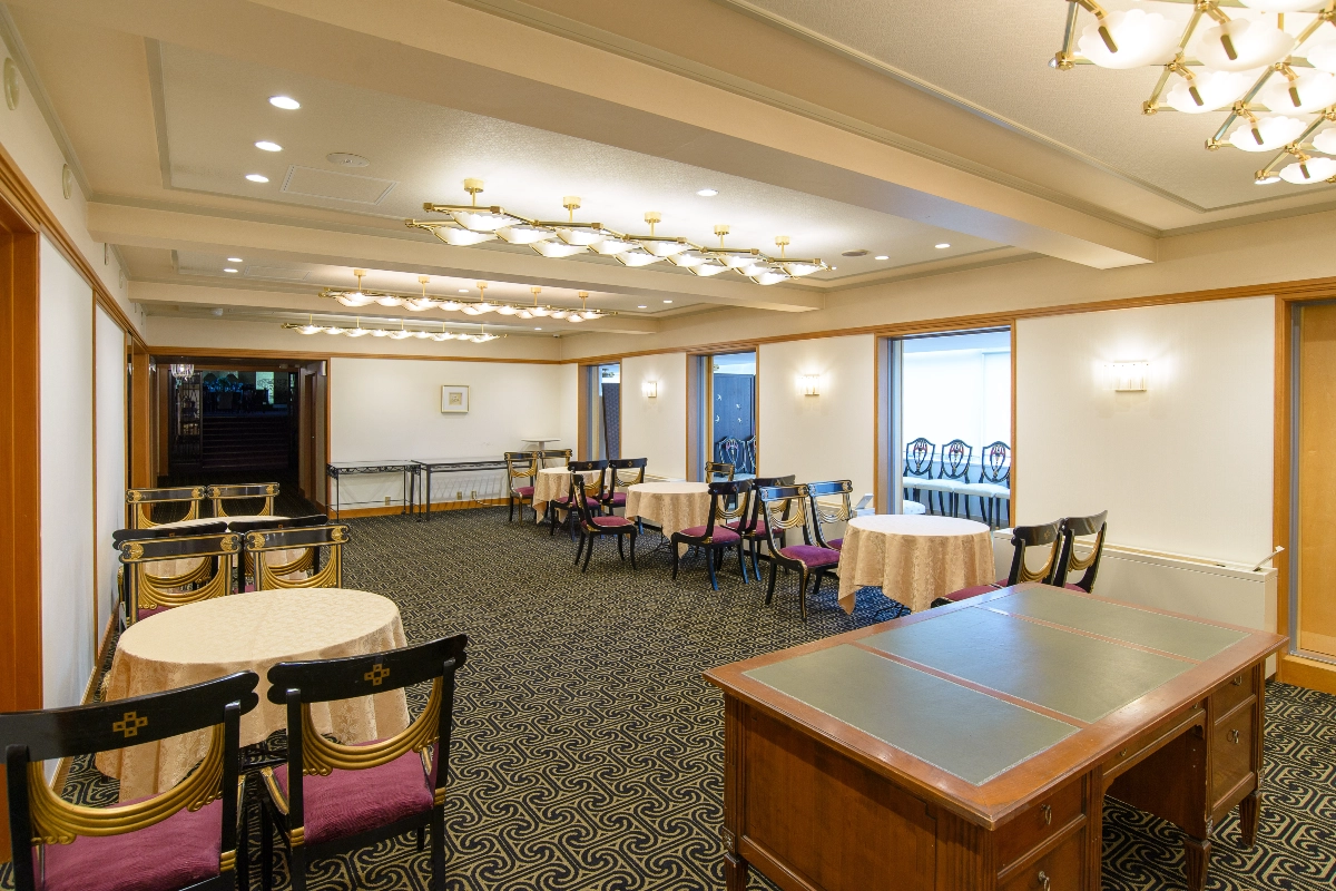 「和魂洋才」を存分に表現し左右の大窓から、自然光を取り入れた爽快で特別感のある収容人数約150名の会場「豊明」。乃木會館で一番大きい会場になり、ドラマ、映画、CM、MVなどのシーン撮影から、バラエティ番組の収録スタジオ、対談場所としてご利用くださいませ。豪華絢爛な式場としてのシチュエーションにピッタリで、大規模なロケ・撮影におすすめです。会場への進む階段は、他にはないカットを狙えます。テーブルや椅子だけでなく、金屏風やカトラリーなどもそのままお貸出しています。休館日であれば、積極的に撮影対応を受け入れておりますので、お気軽にご相談くださいませ。