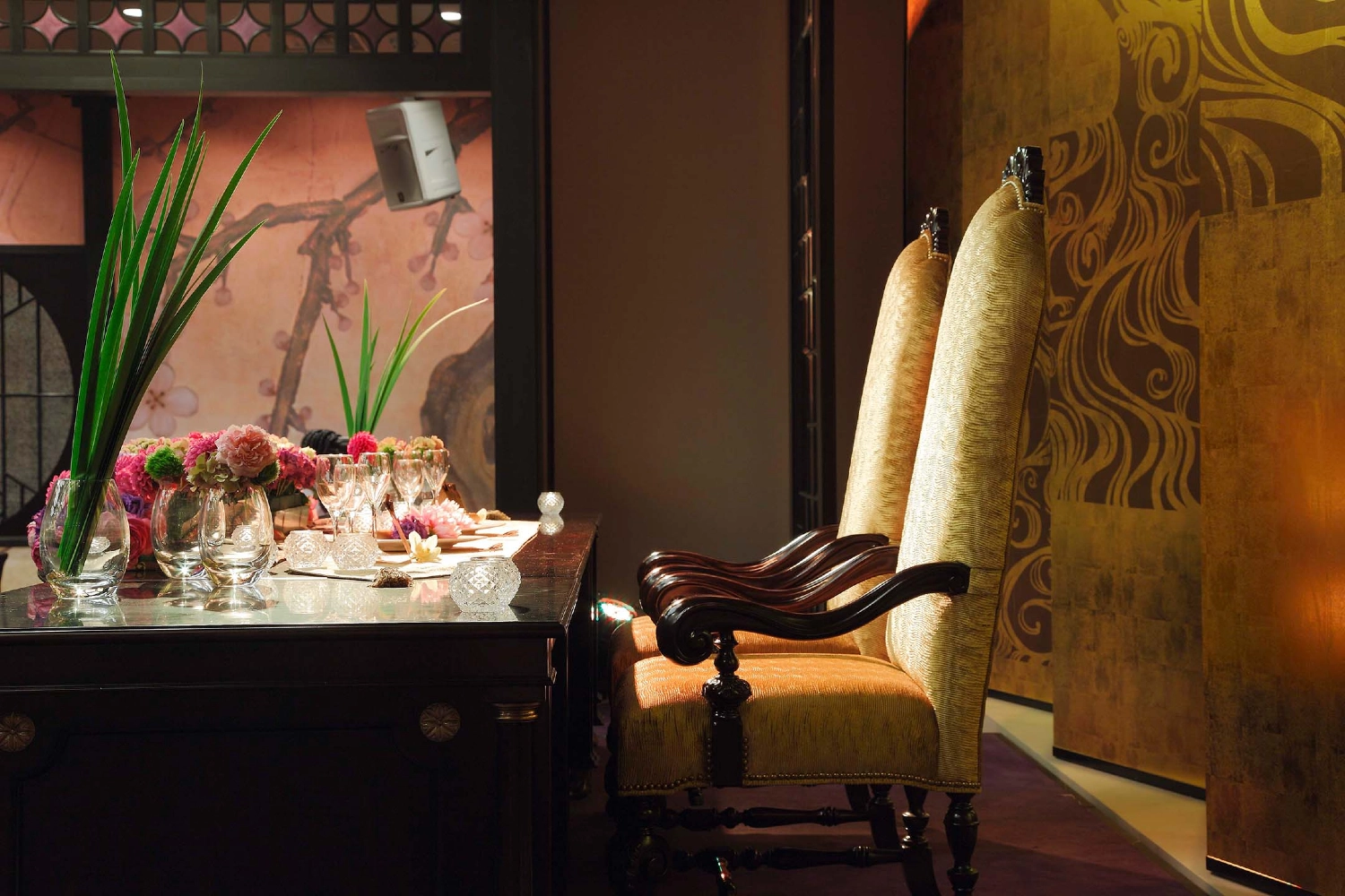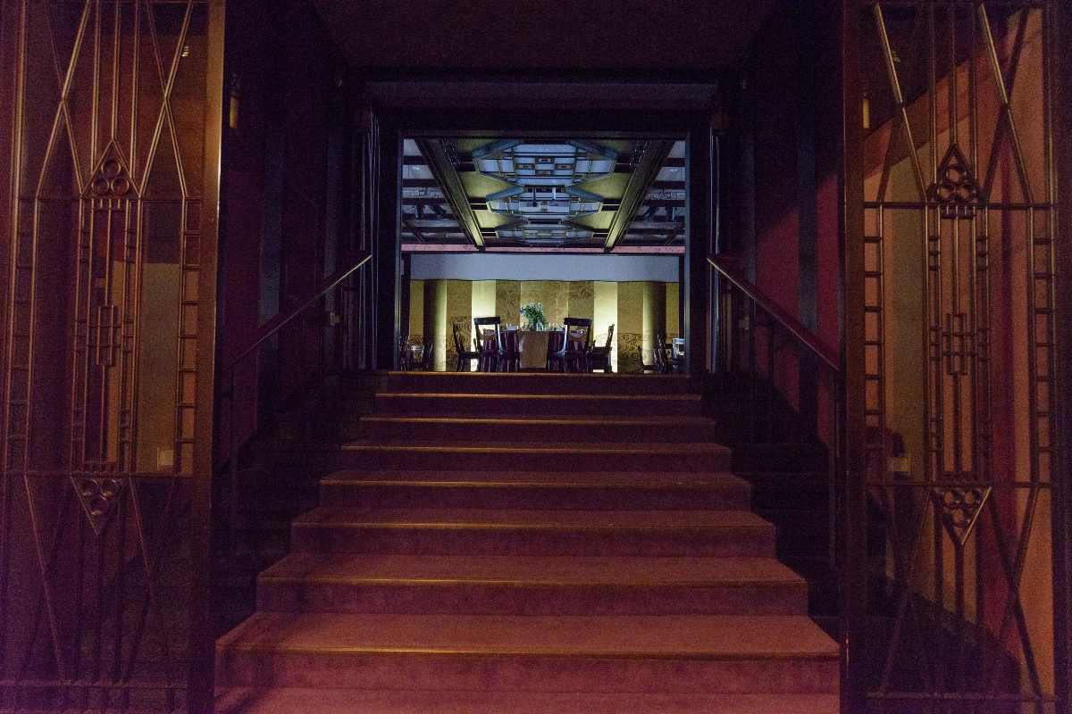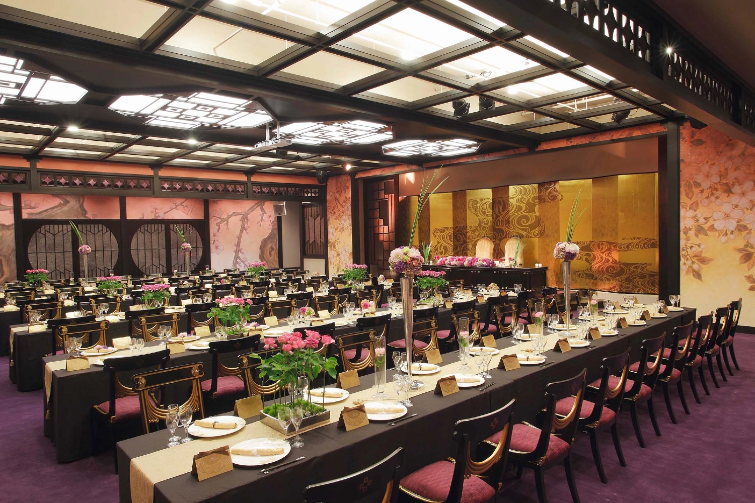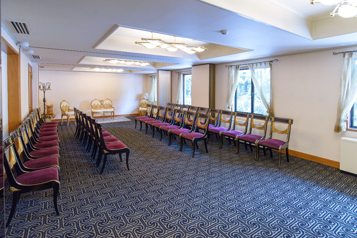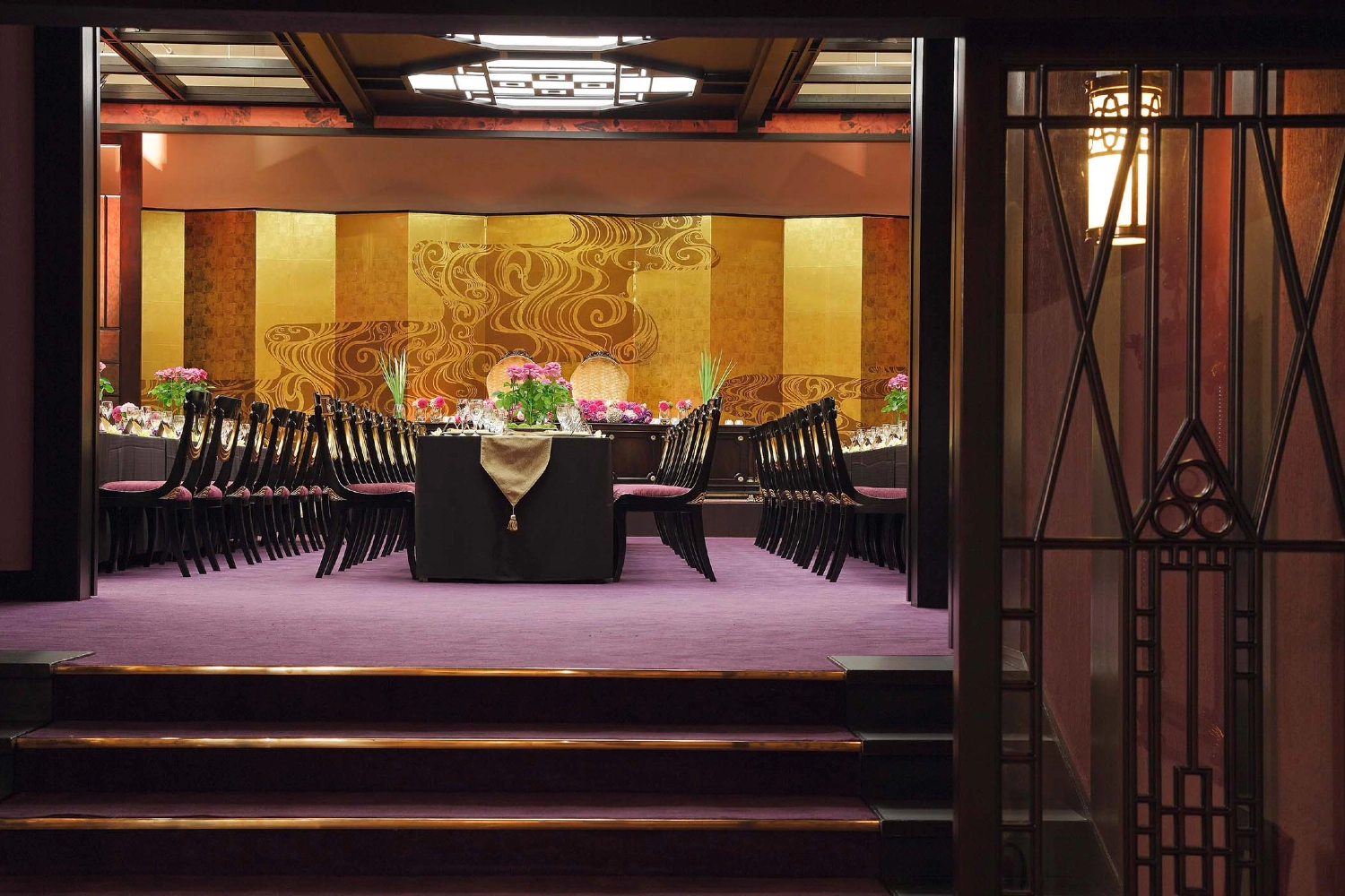 「和魂洋才」を存分に表現し左右の大窓から、自然光を取り入れた爽快で特別感のある収容人数約150名の会場「豊明」。乃木會館で一番大きい会場になり、ドラマ、映画、CM、MVなどのシーン撮影から、バラエティ番組の収録スタジオ、対談場所としてご利用くださいませ。豪華絢爛な式場としてのシチュエーションにピッタリで、大規模なロケ・撮影におすすめです。会場への進む階段は、他にはないカットを狙えます。テーブルや椅子だけでなく、金屏風やカトラリーなどもそのままお貸出しています。休館日であれば、積極的に撮影対応を受け入れておりますので、お気軽にご相談くださいませ。