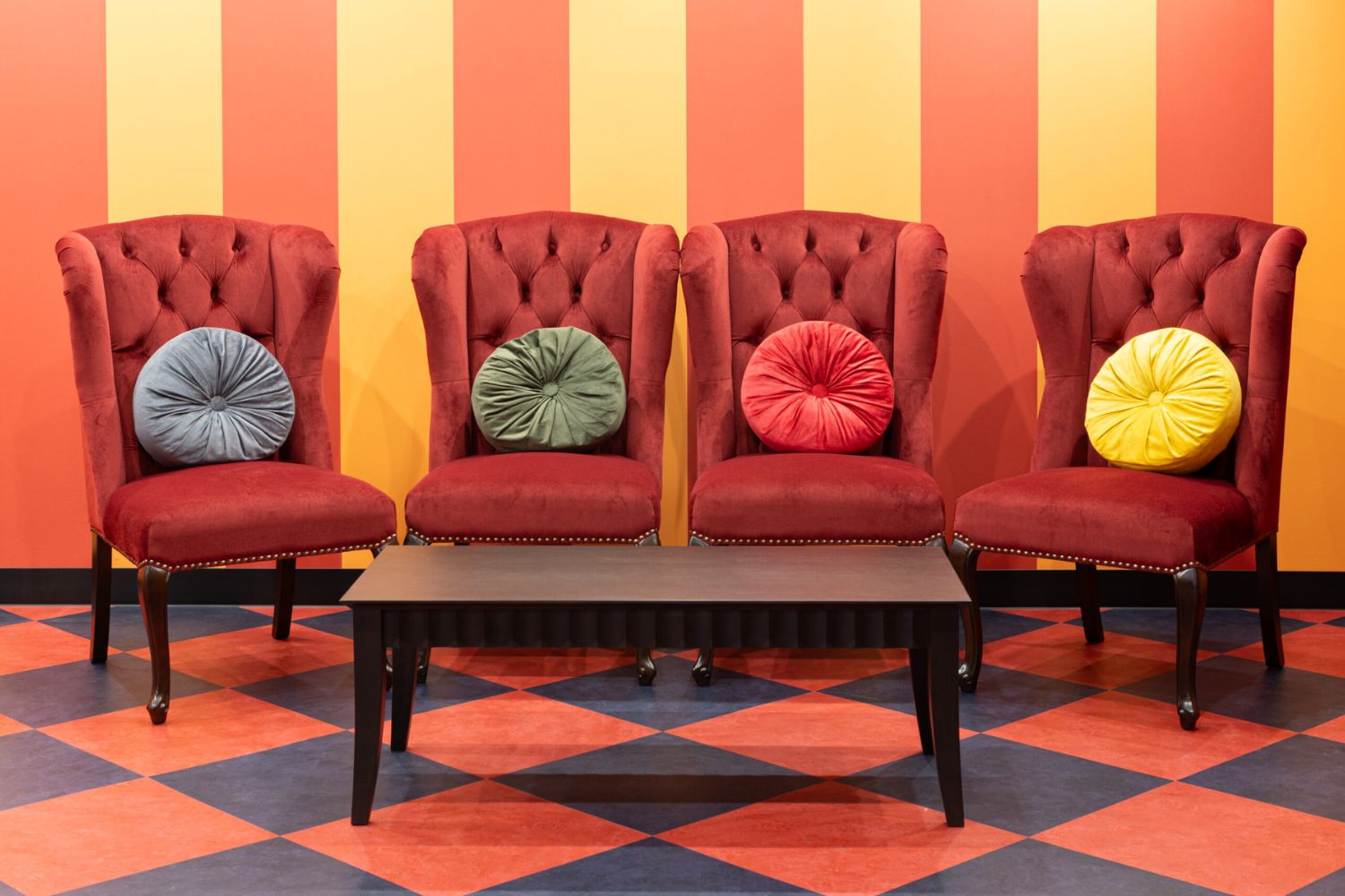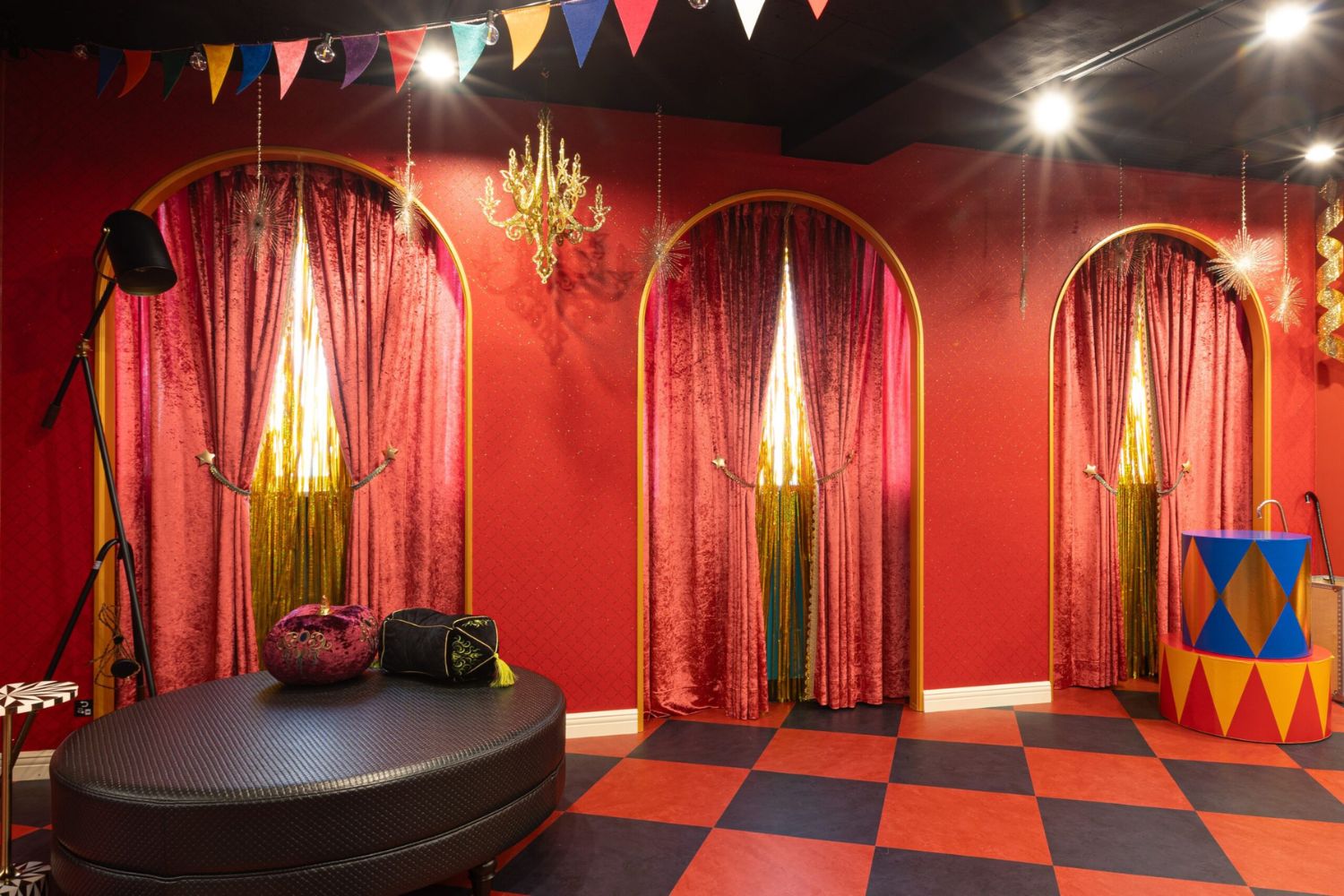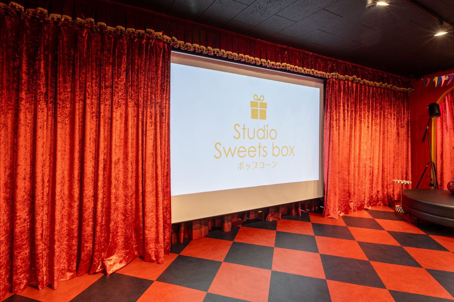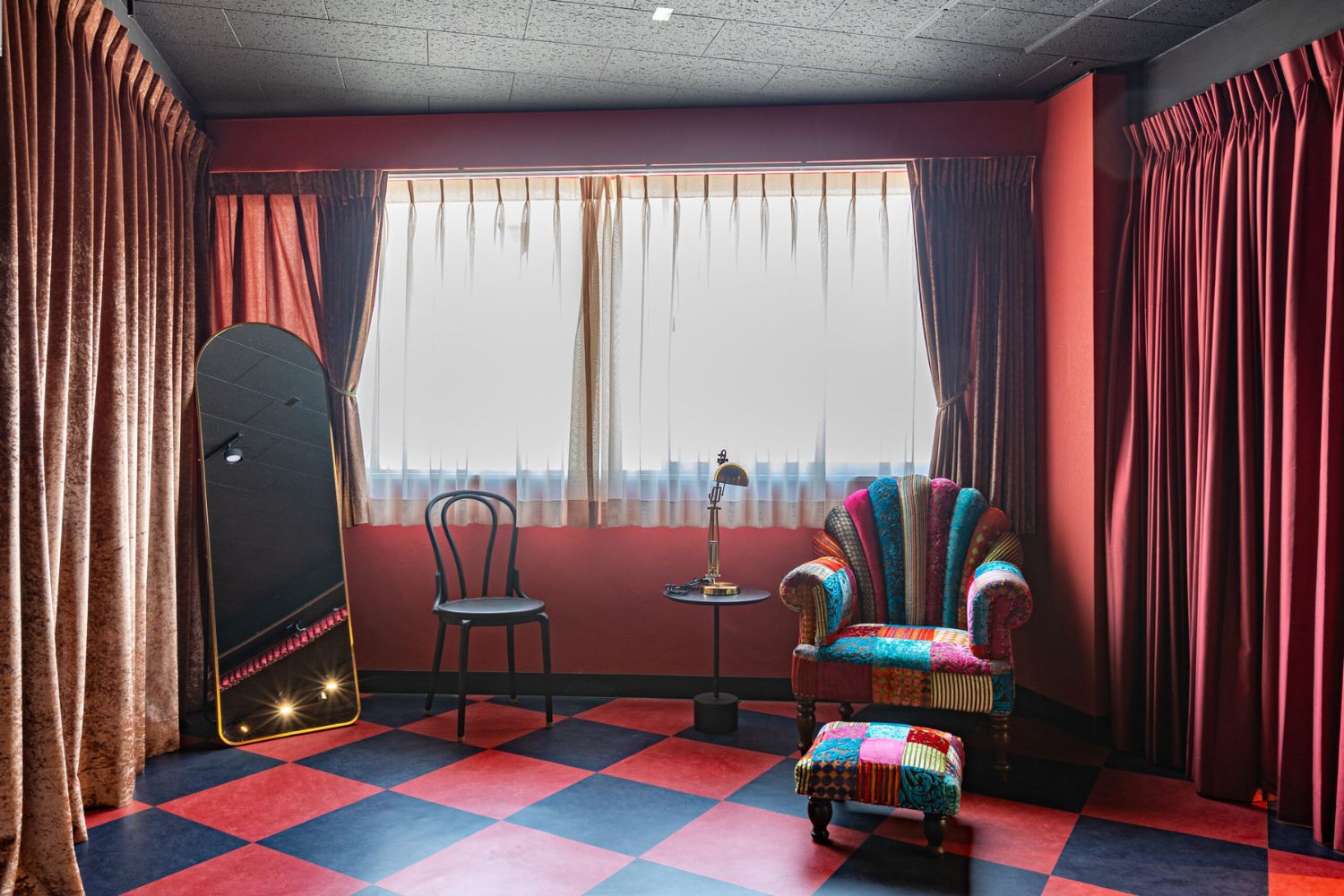 赤黒のタイル・舞台風のカーテン・大型プロジェクター!サーカス&シアターがコンセプトのスタジオ