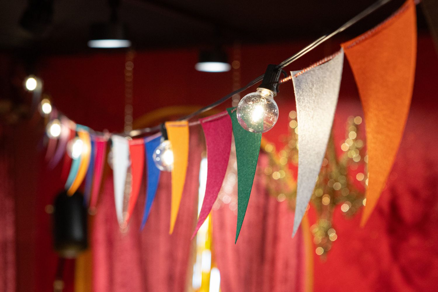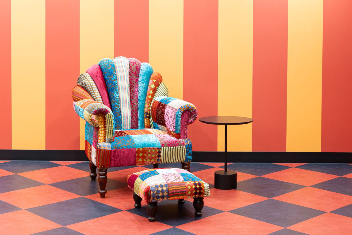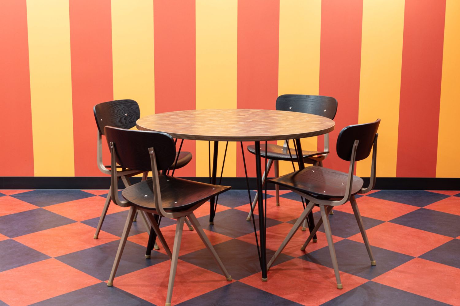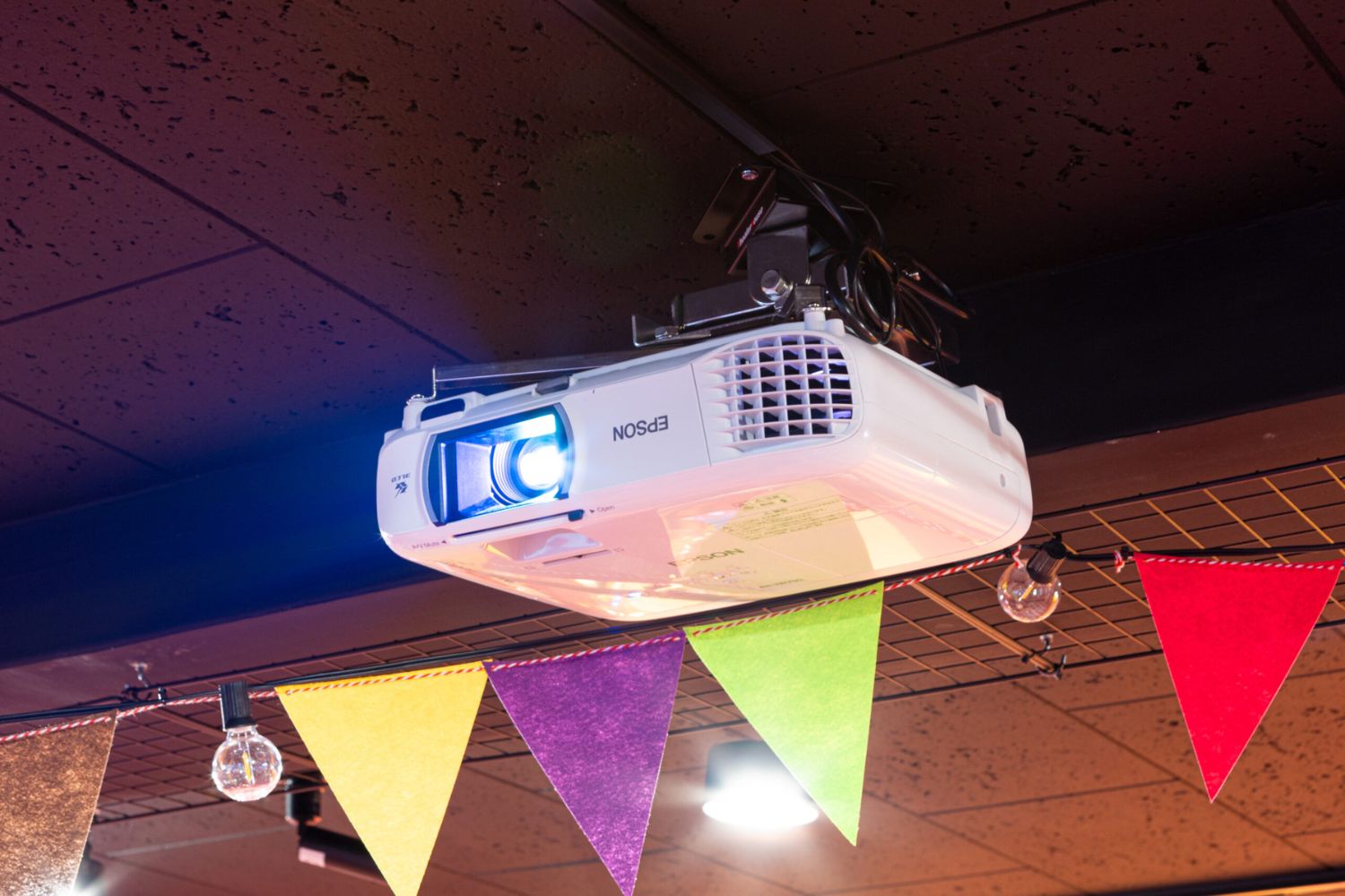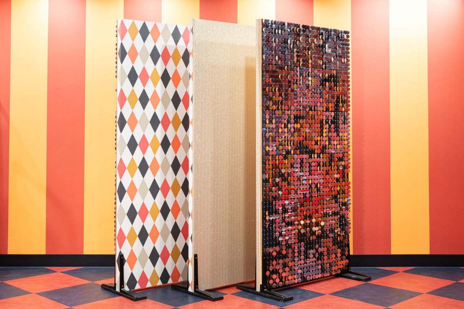 赤黒のタイル・舞台風のカーテン・大型プロジェクター!サーカス&シアターがコンセプトのスタジオ