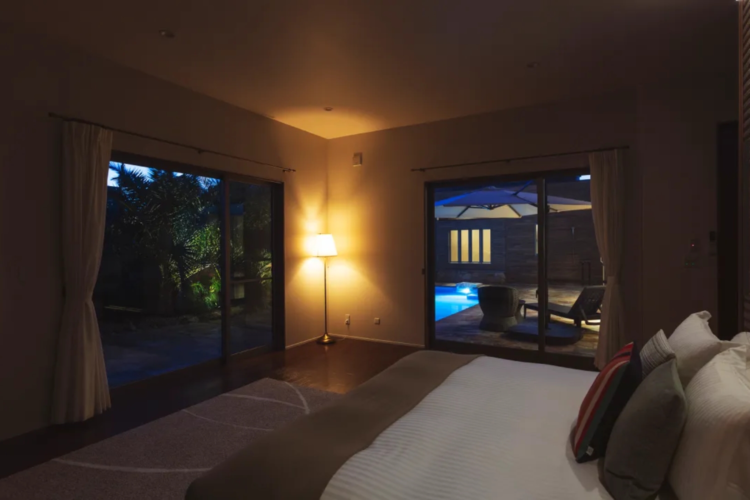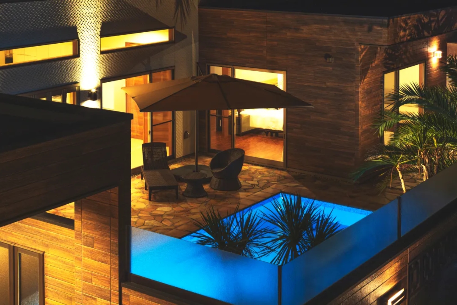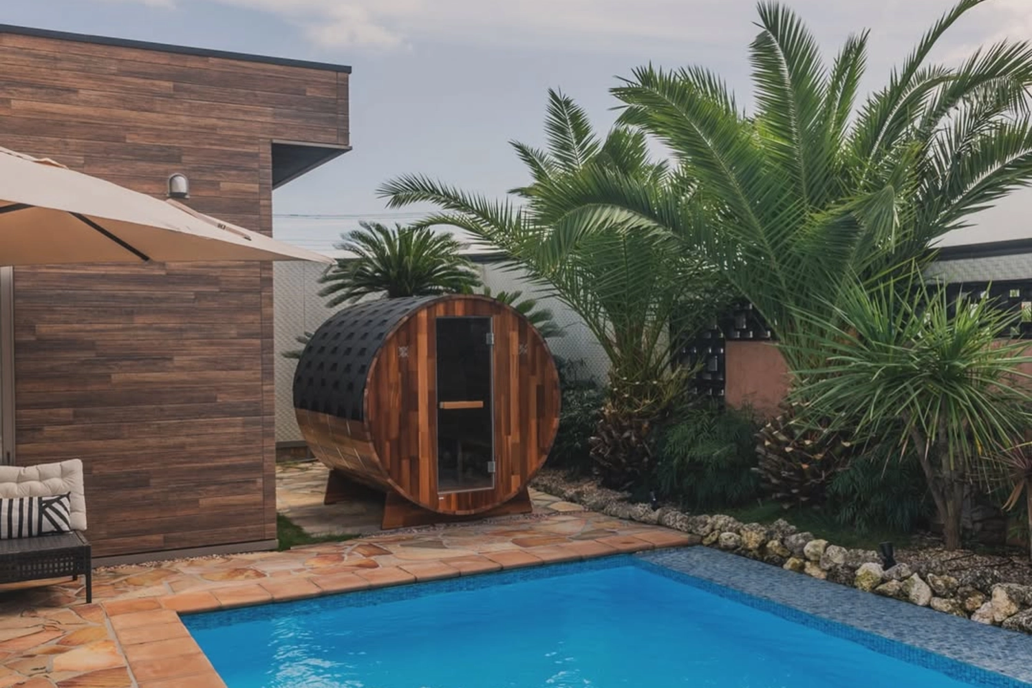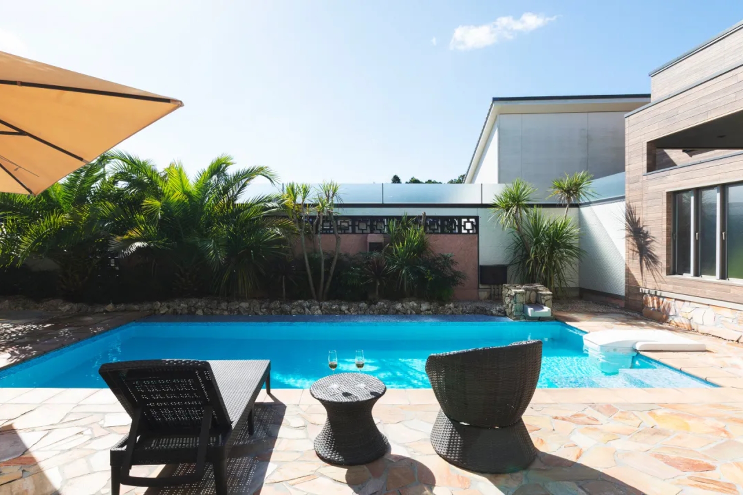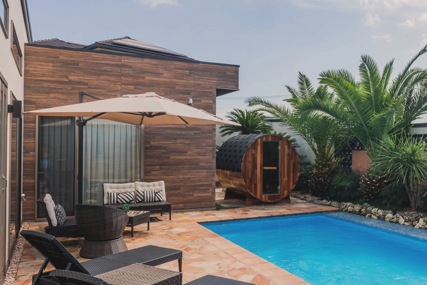 椰子の木が生い茂る南国リゾートそのまま!大型プールに、バレルサウナを完備する一棟貸切ラグジュアリー別荘