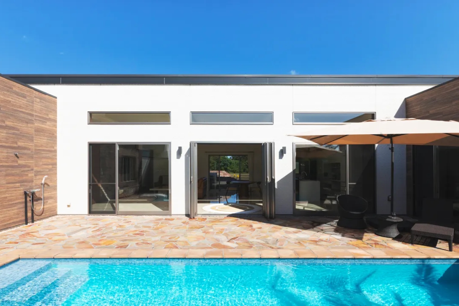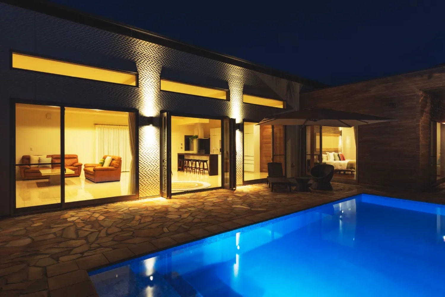 都内から車でわずか1時間半という好アクセス、1日1組限定のプール付き185㎡の一棟貸別荘です。明るく開放的なリビングルームには、心地よい陽光が差し込み、夜はライトアップされムーディな雰囲気に包まれます。2つのベッドルームにはキングサイズとクイーンサイズのベッドを完備し、メインベッドルームにはソファーベッドや布団セットもご用意しておりますので、あらゆる滞在スタイルに対応可能です。また、プライベートプールでリゾート気分を満喫し、ガス式の本格BBQ設備を利用して地元の美味しい食材を楽しむこともできます。広々としたキッチンには、調理器具・家電・食器が充実しており、ご家族でBBQを楽しんだり、ご自宅とは気分を変えて料理を作ったりするのに最適です。この贅沢なプライベート空間で、日常を忘れ、心地よい時間をお過ごしください。
