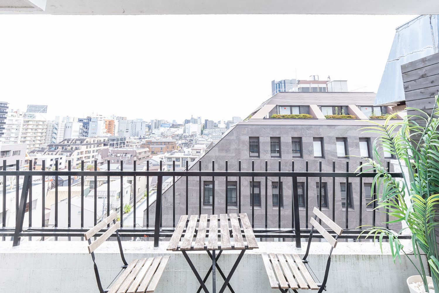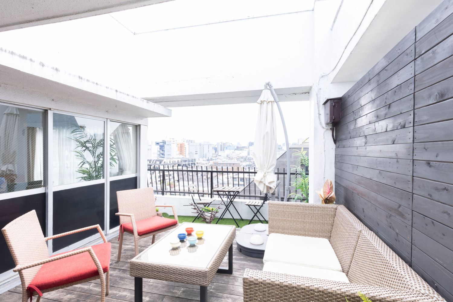 広さは約25平米のルーフバルコニーも併設しています。見上げれば青空や星空、見回せば都会のパノラマの絶景ローケーションです。ガーデンファーニチャーと白壁との相性は抜群で、まるで南仏のリゾートのよう空間です。こちらも合わせて、ぜひご利用ください。