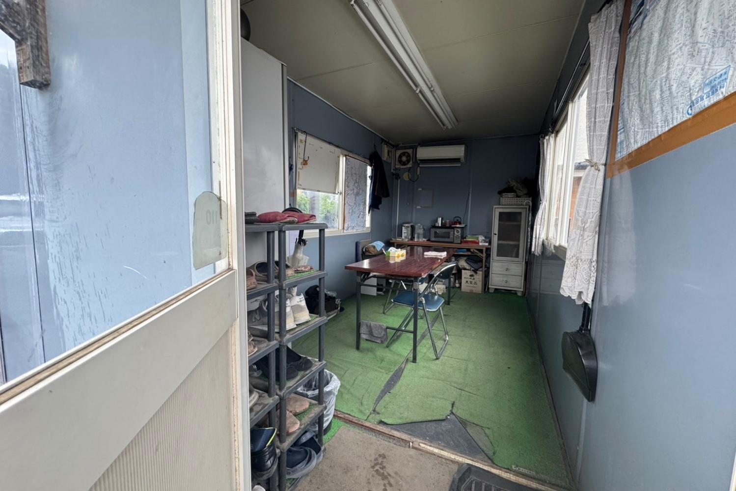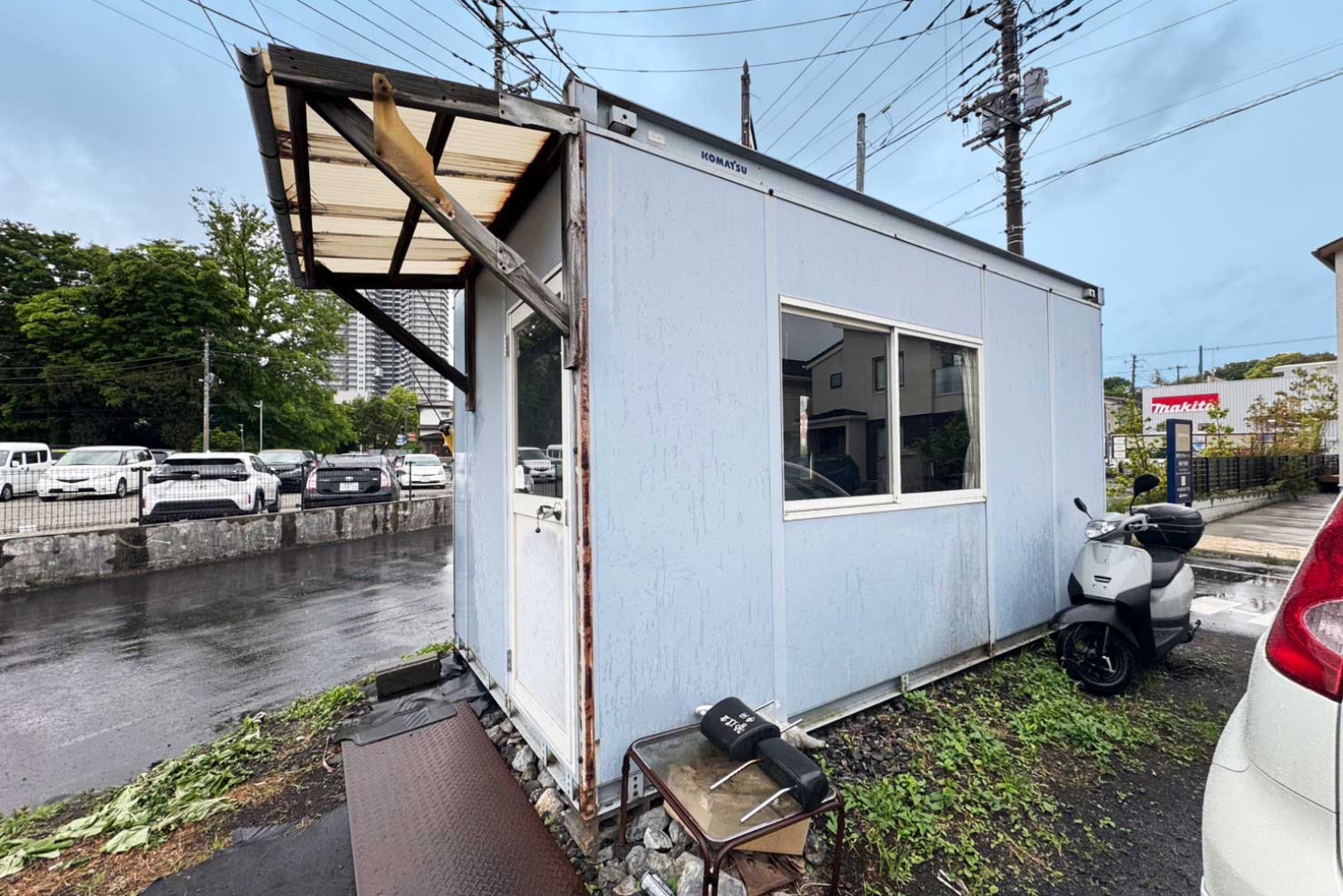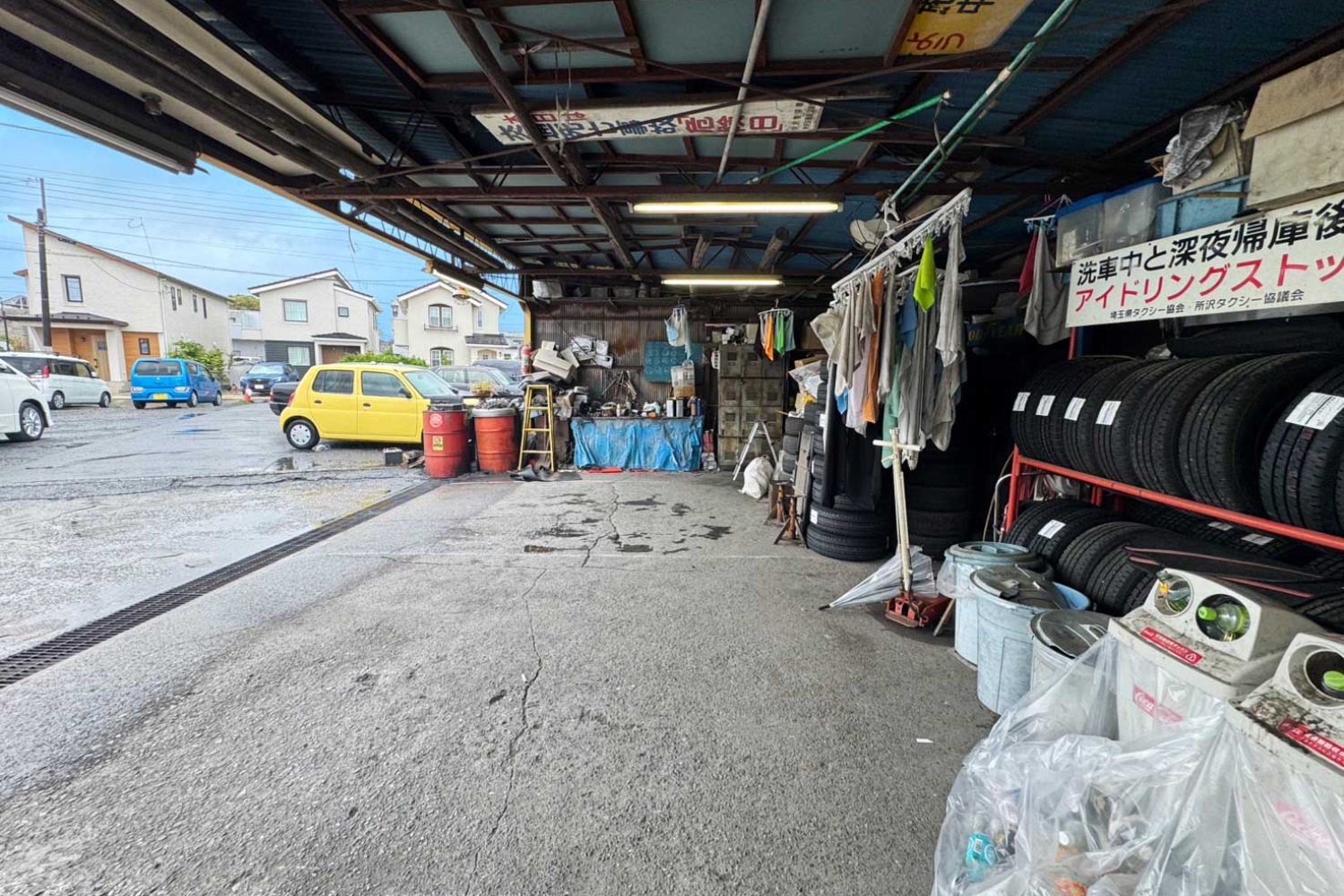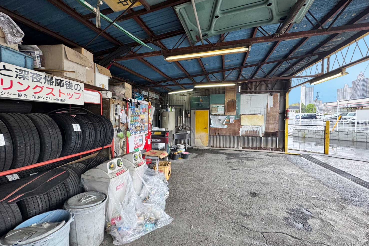 自動販売機も設置されるプレハブと整備スペースを兼ね備えるタクシー車庫