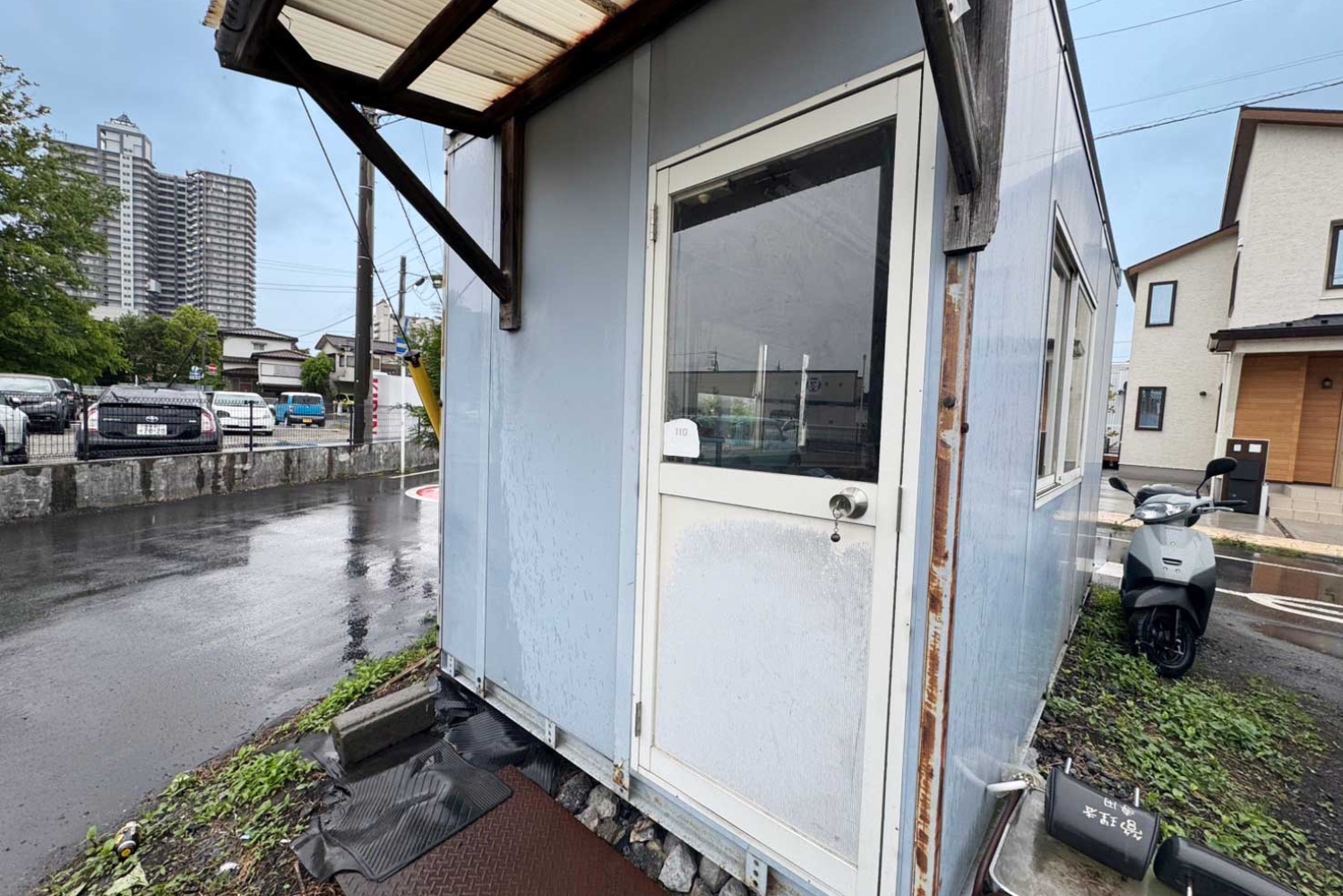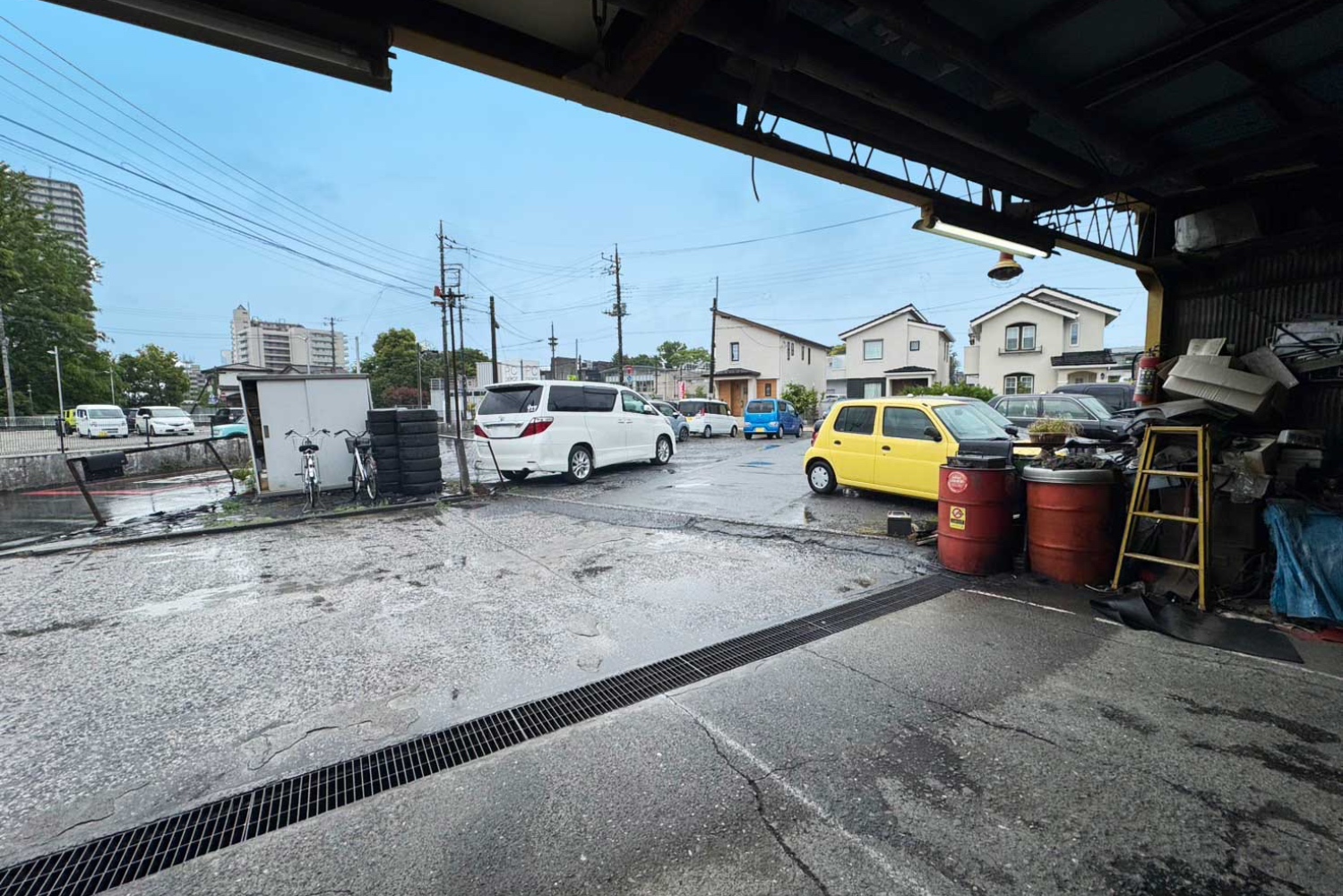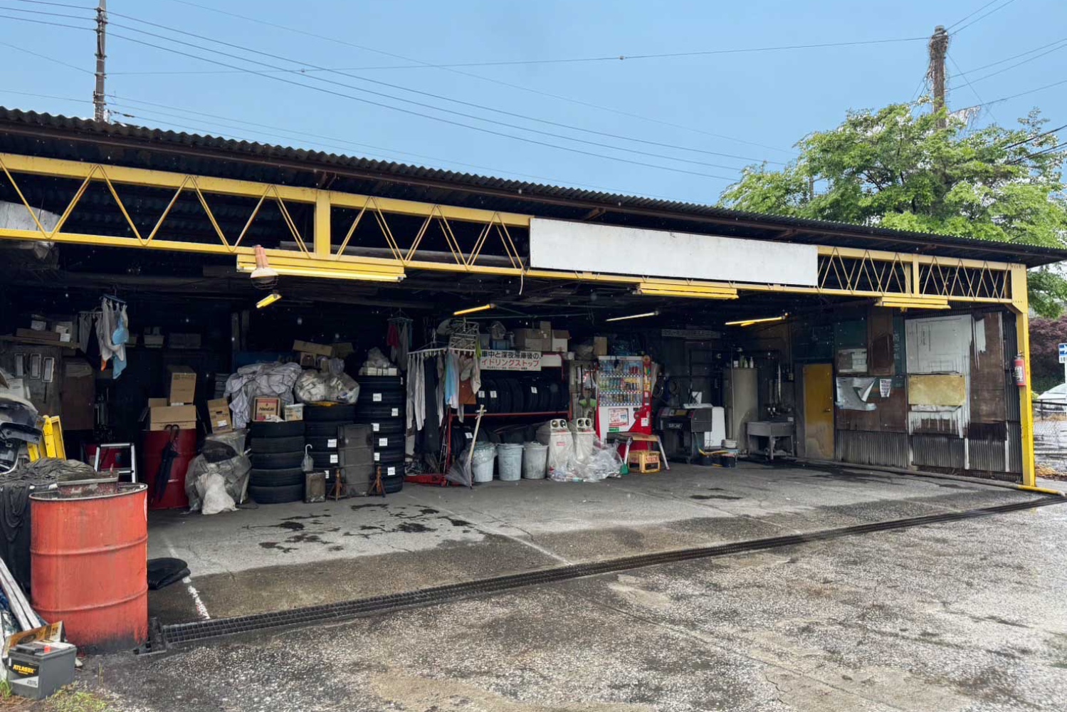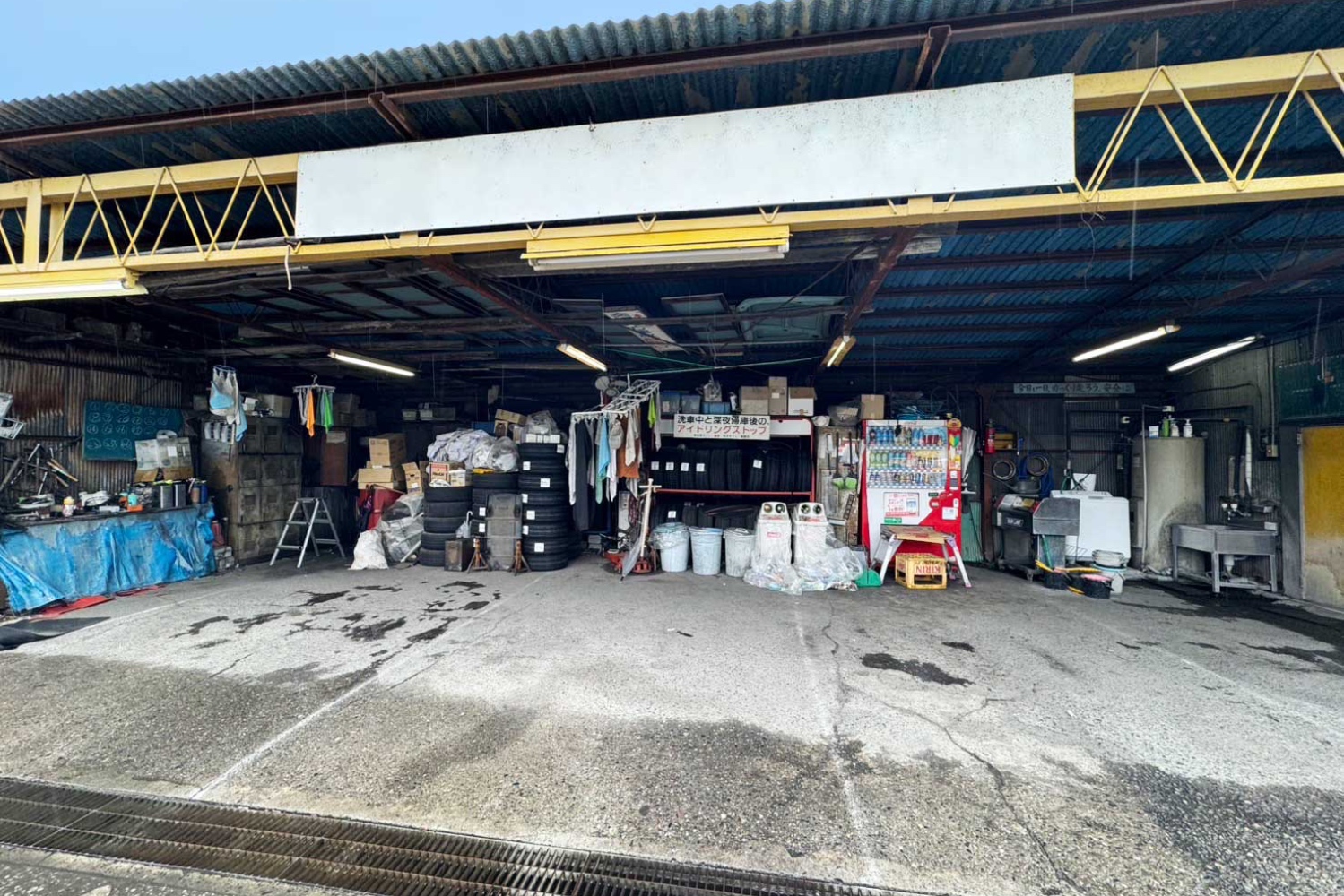 自動販売機も設置されるプレハブと整備スペースを兼ね備えるタクシー車庫