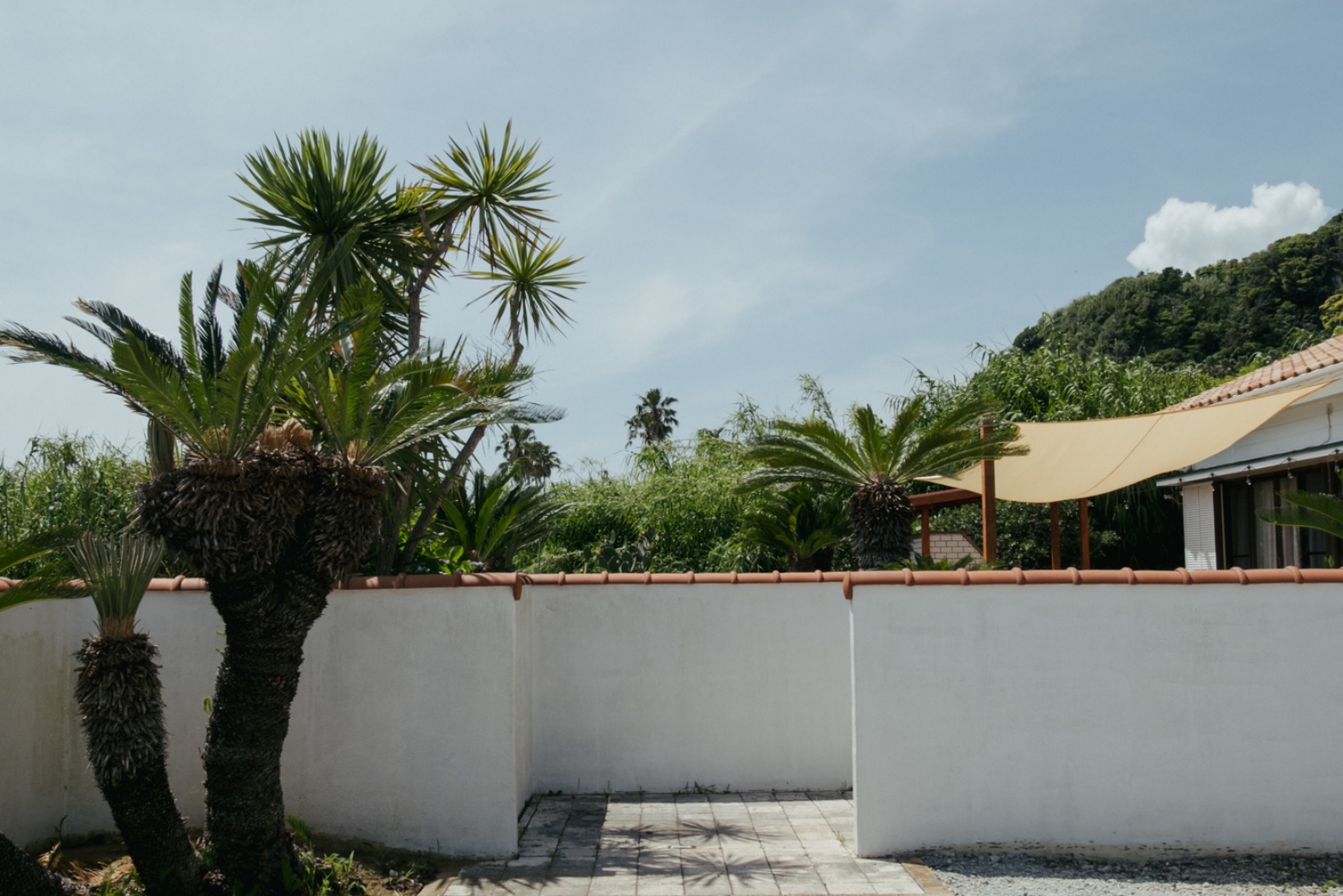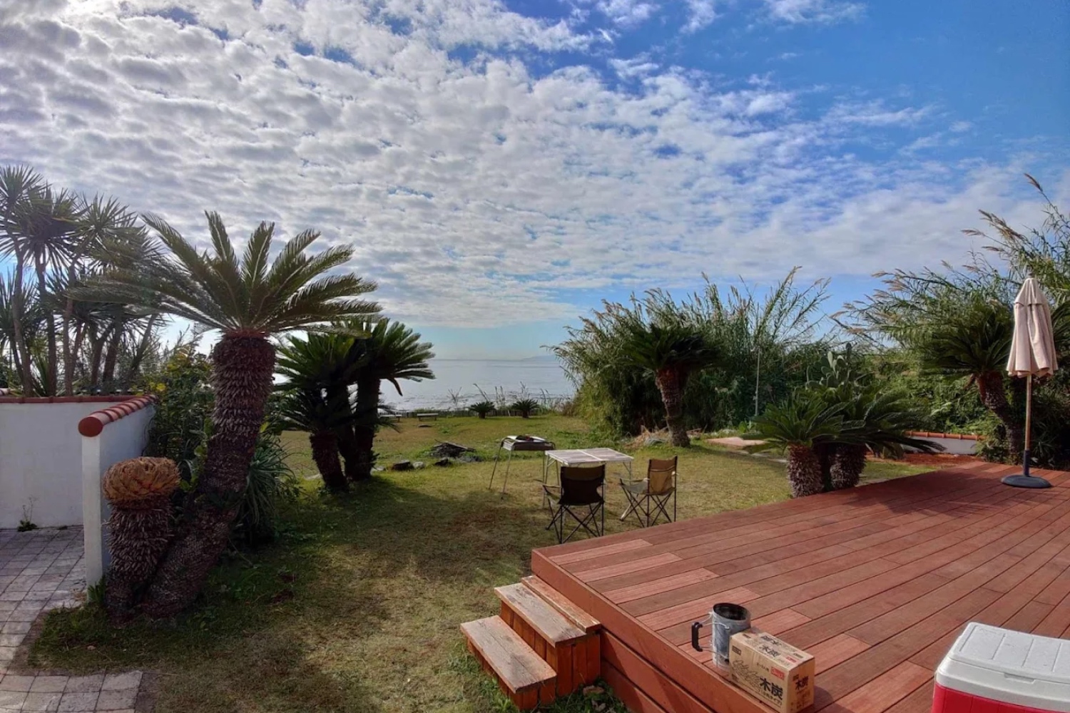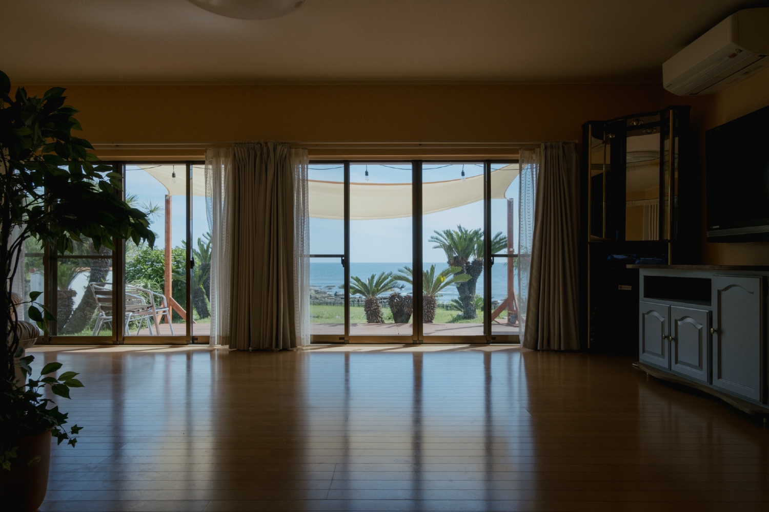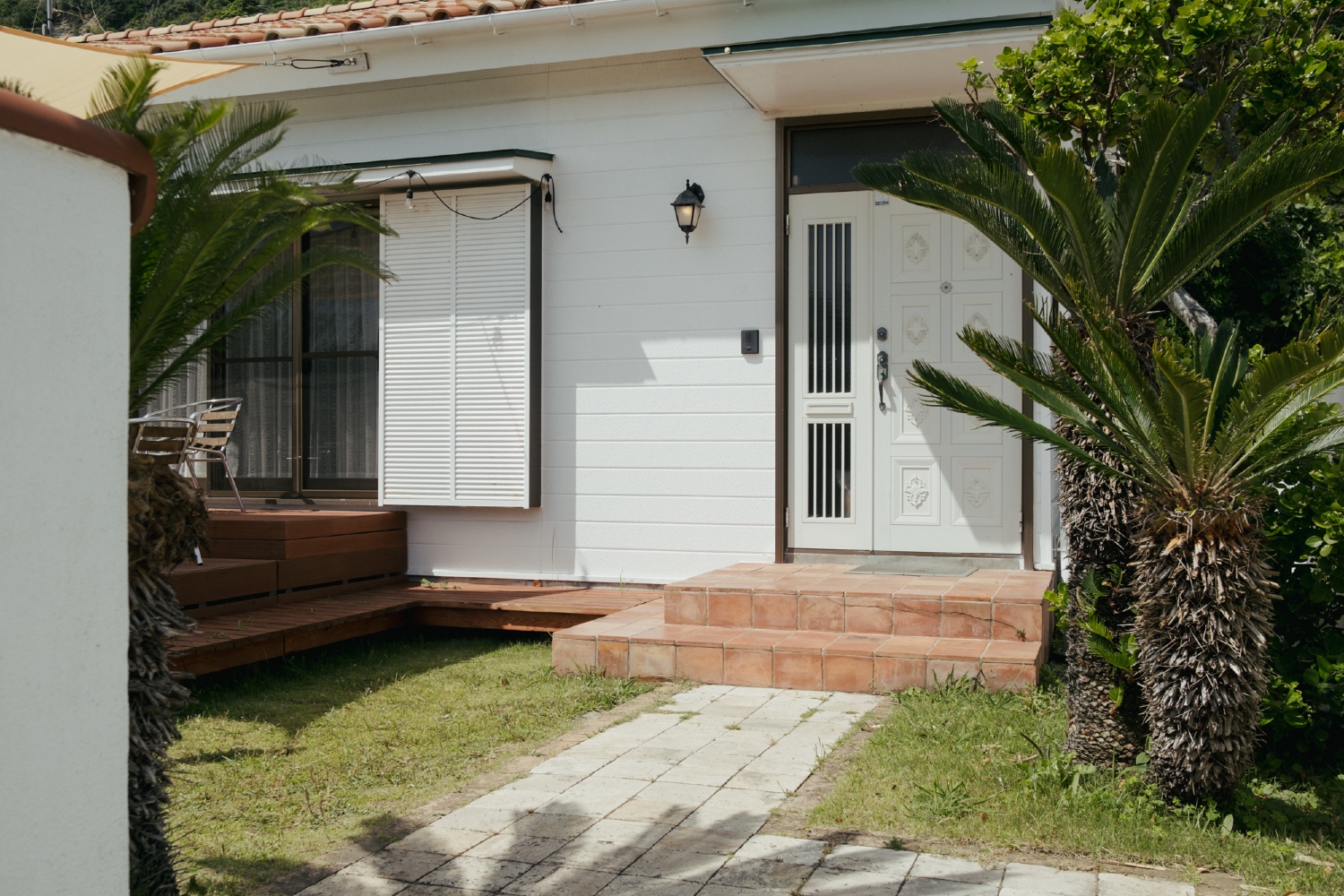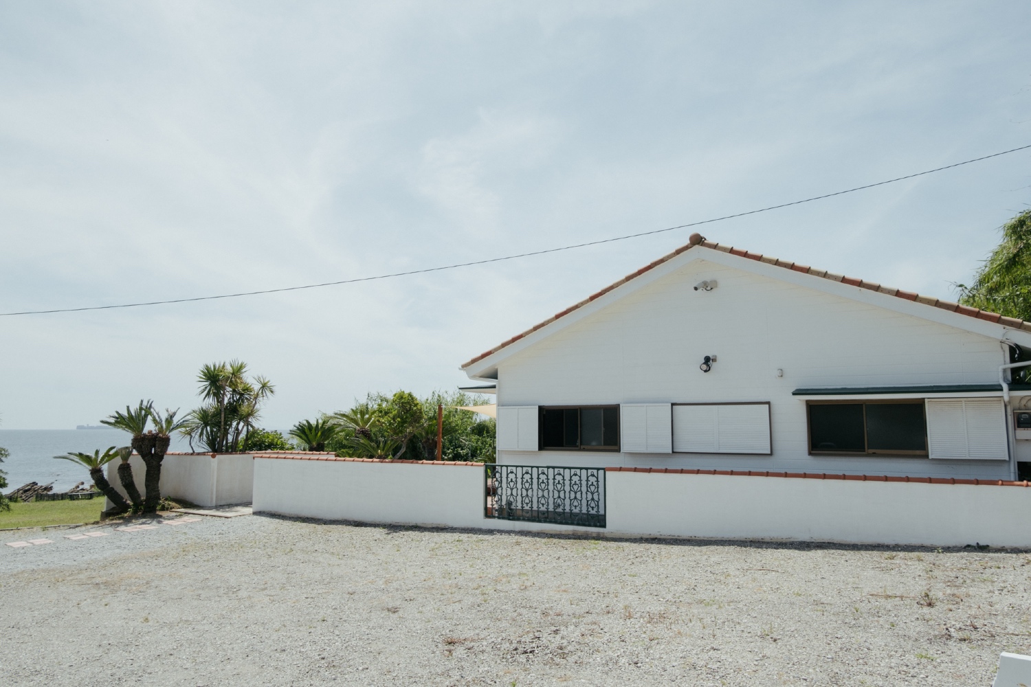 海を独り占めできる圧倒的なロケーションが自慢の貸別荘です。落ち着いた平家で、リビング、寝室だけでなく、12畳の和室も完備。広い庭も自慢で、南国の植物、ヤシの木や気持ちのいい自然にも囲まれています。リビングから覗く海、ウッドデッキから広がる海と空。海の青と、自然の緑、建物の温もりが1カットに収まります。ドラマ、映画、CM、MVなどのあらゆるシーン撮影におすすめです。これまで多数の作品に協力しており、お気軽にお問い合わせください。