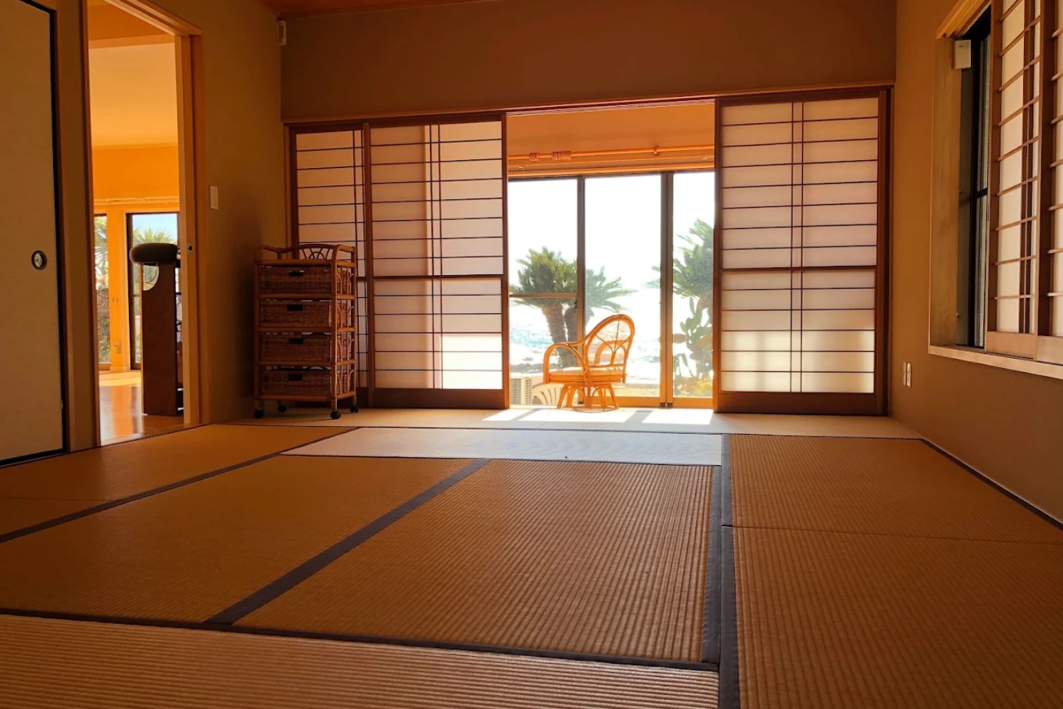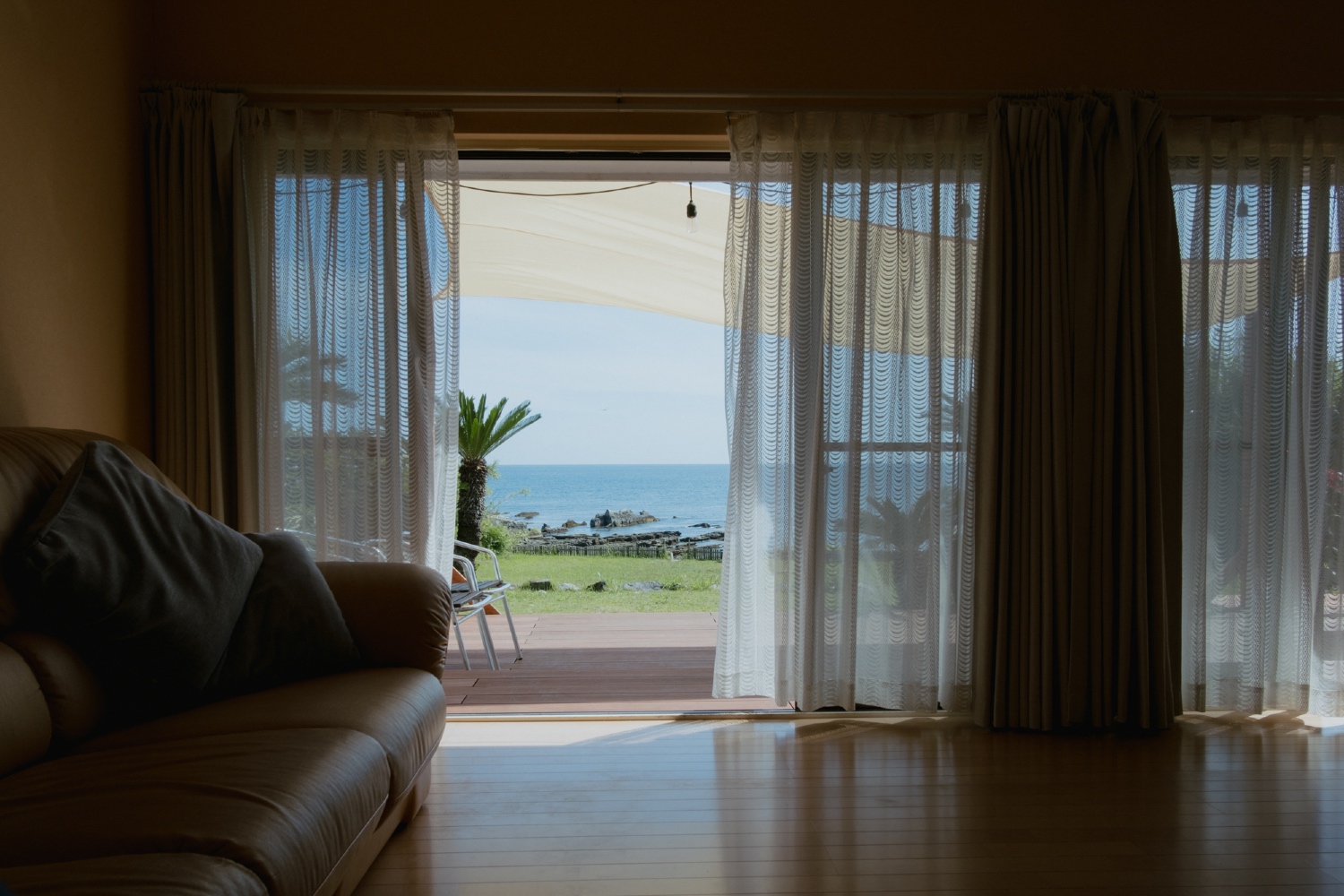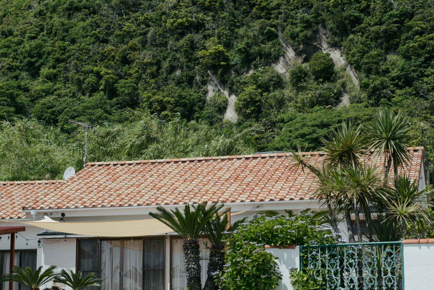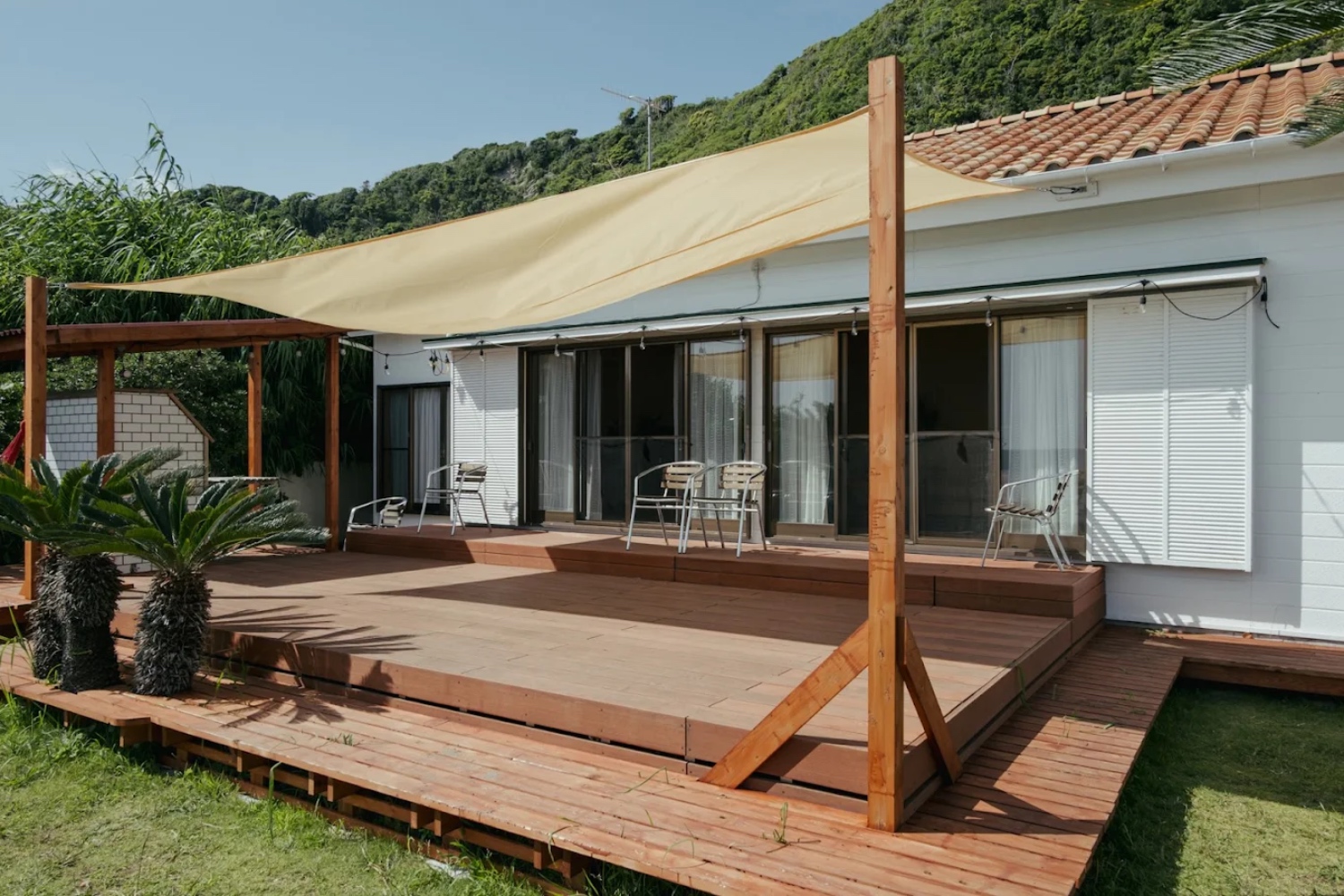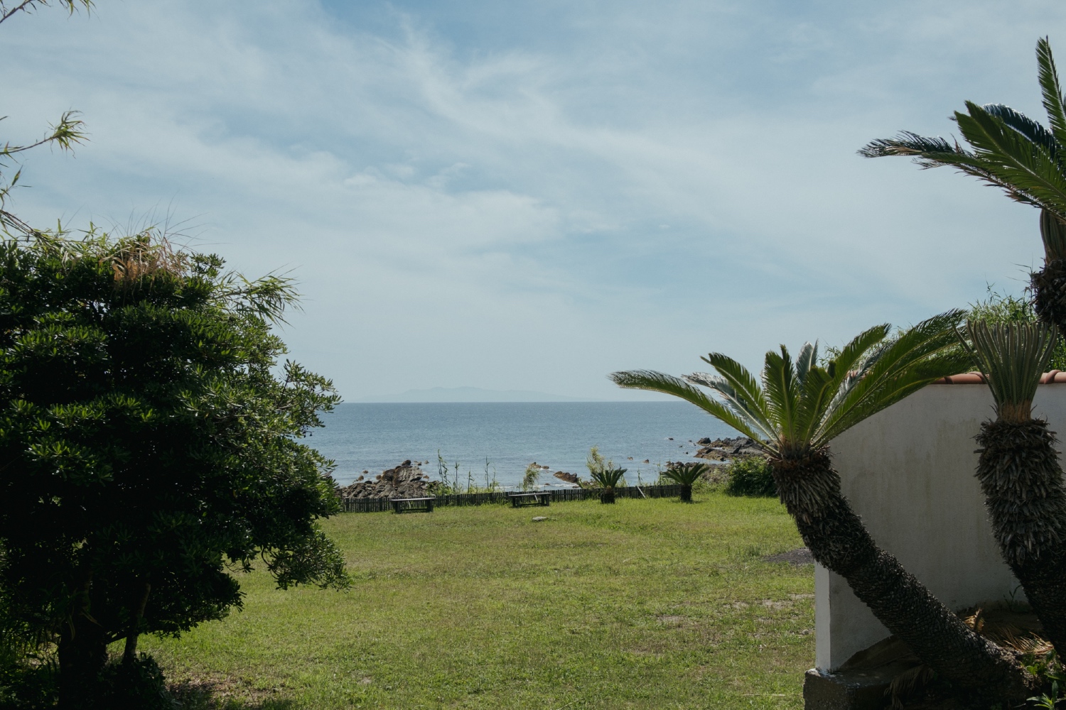 海を独り占めできる圧倒的なロケーションが自慢の貸別荘です。落ち着いた平家で、リビング、寝室だけでなく、12畳の和室も完備。広い庭も自慢で、南国の植物、ヤシの木や気持ちのいい自然にも囲まれています。リビングから覗く海、ウッドデッキから広がる海と空。海の青と、自然の緑、建物の温もりが1カットに収まります。ドラマ、映画、CM、MVなどのあらゆるシーン撮影におすすめです。これまで多数の作品に協力しており、お気軽にお問い合わせください。