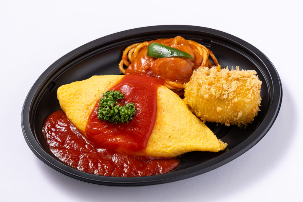 | チキンのケチャップライスが入ったオムライスとオリジナルの濃厚なリッチクリームコロッケ、昔ながらのナポリタンがセットになったバランスと満足度の高いお弁当です。 |